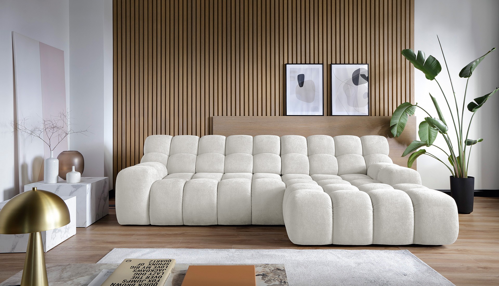 Głównym elementem linii Campile Wersal są narożniki z elektrycznie wysuwanym siedziskiem. Są one wolnostojące, z tyłem wykończonym tą samą tkaniną, więc można ustawić je przy ścianie albo na środku pokoju, aby wyznaczyć strefę wypoczynku.
