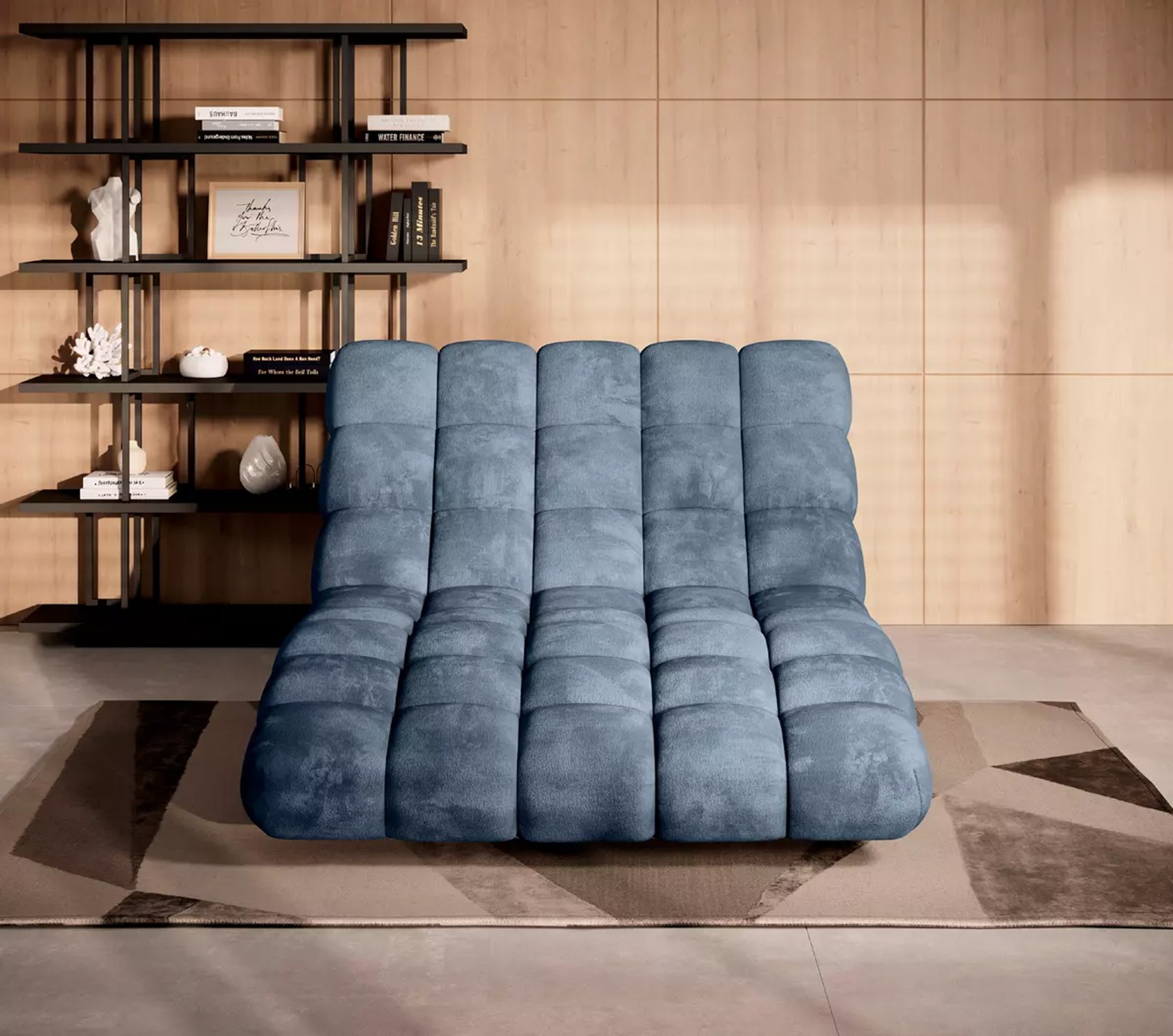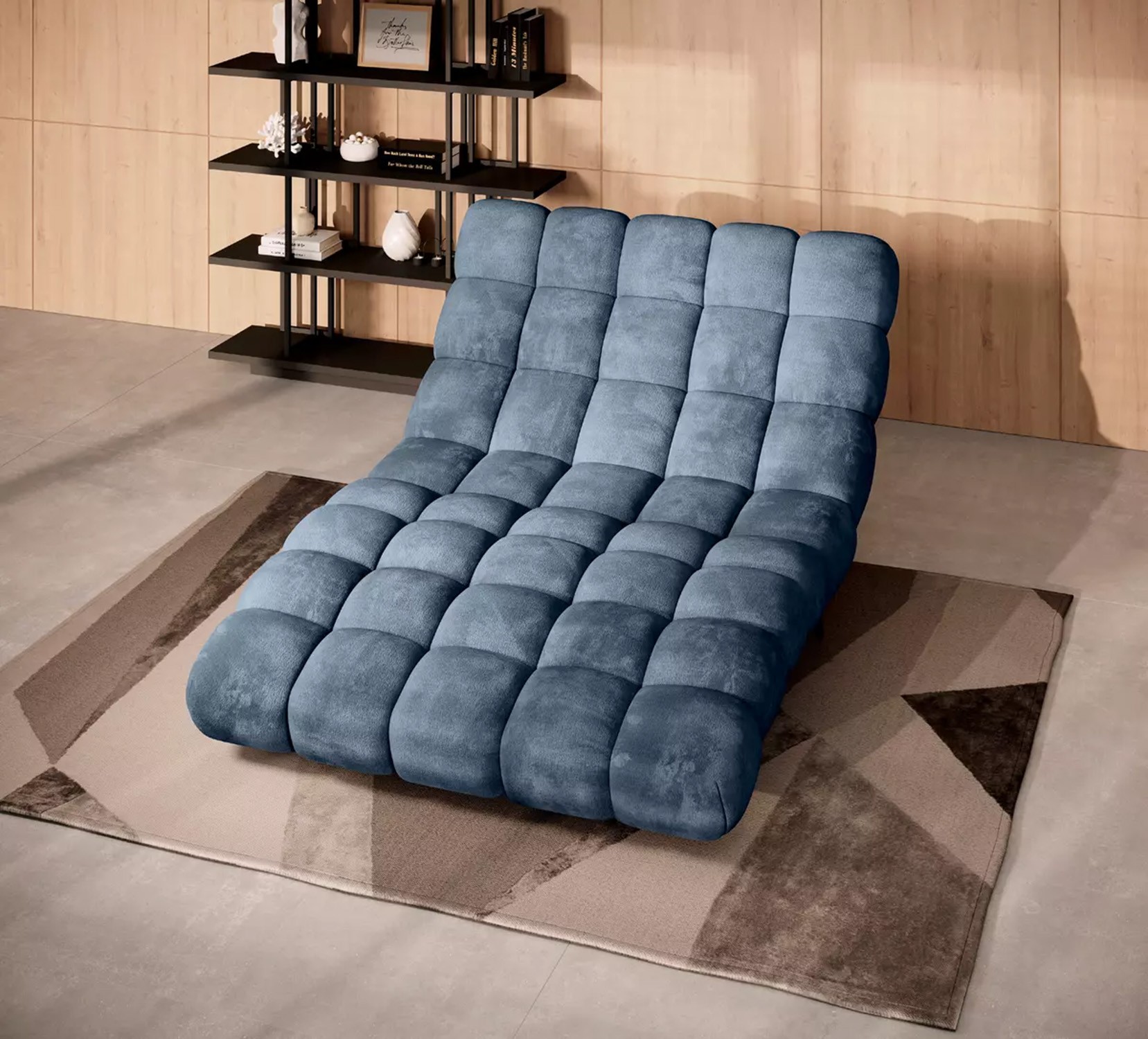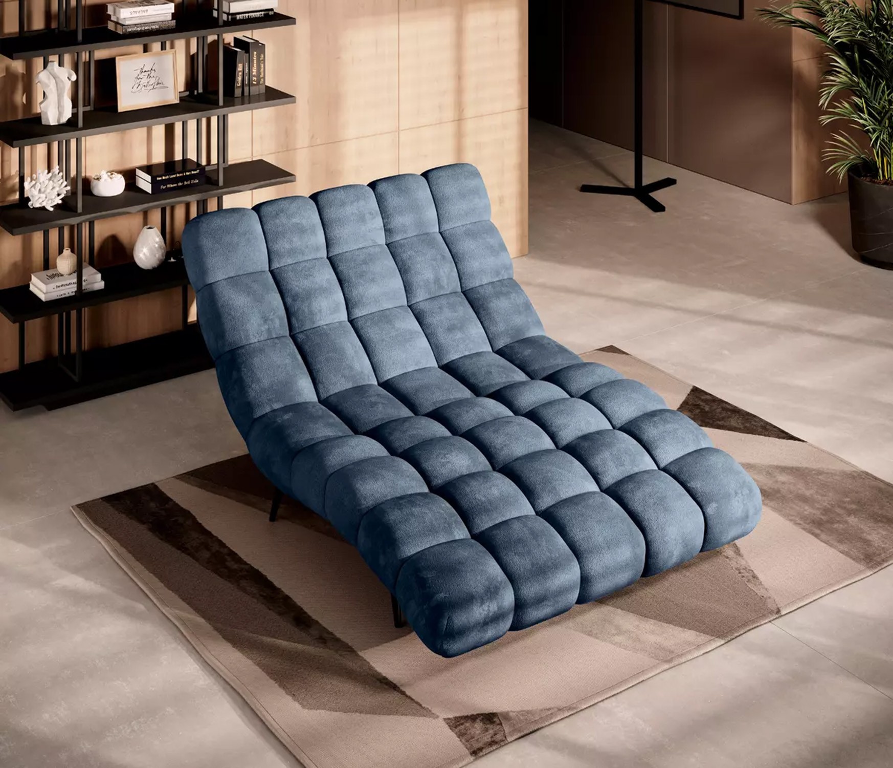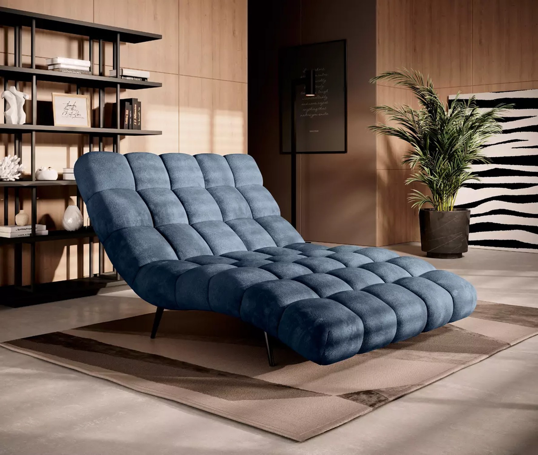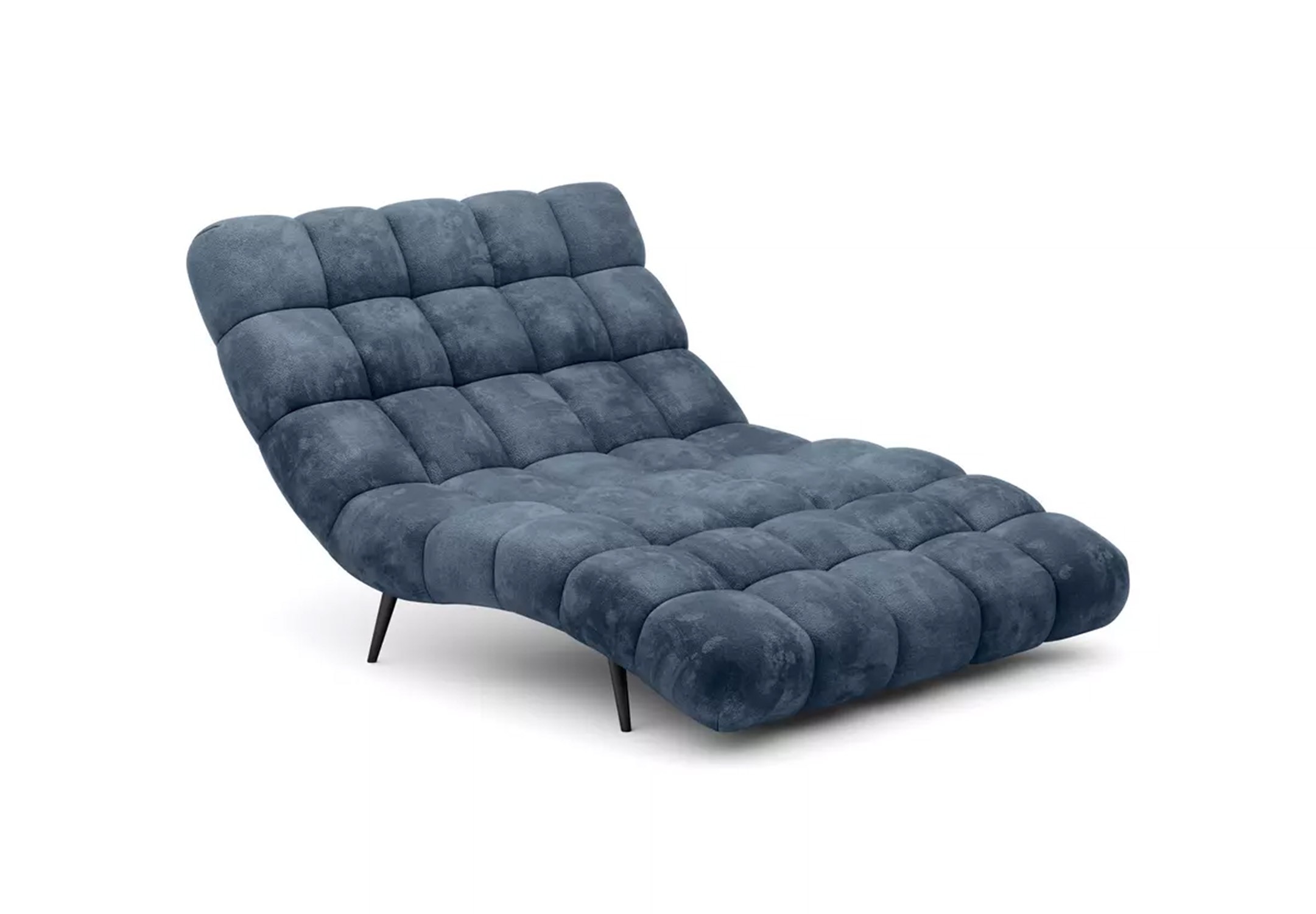 Solidne, czarne nogi nadają całości ponadczasowego charakteru i stabilności, a wykończenie tylnej części tą samą tkaniną sprawia, że szezlong jest meblem wolnostojącym, który prezentuje się efektownie z każdej strony.