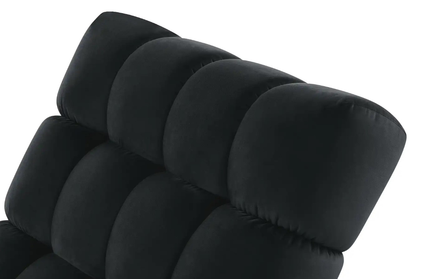 Solidne, czarne nogi nadają całości ponadczasowego charakteru i stabilności, a wykończenie tylnej części tą samą tkaniną sprawia, że szezlong jest meblem wolnostojącym, który prezentuje się efektownie z każdej strony.