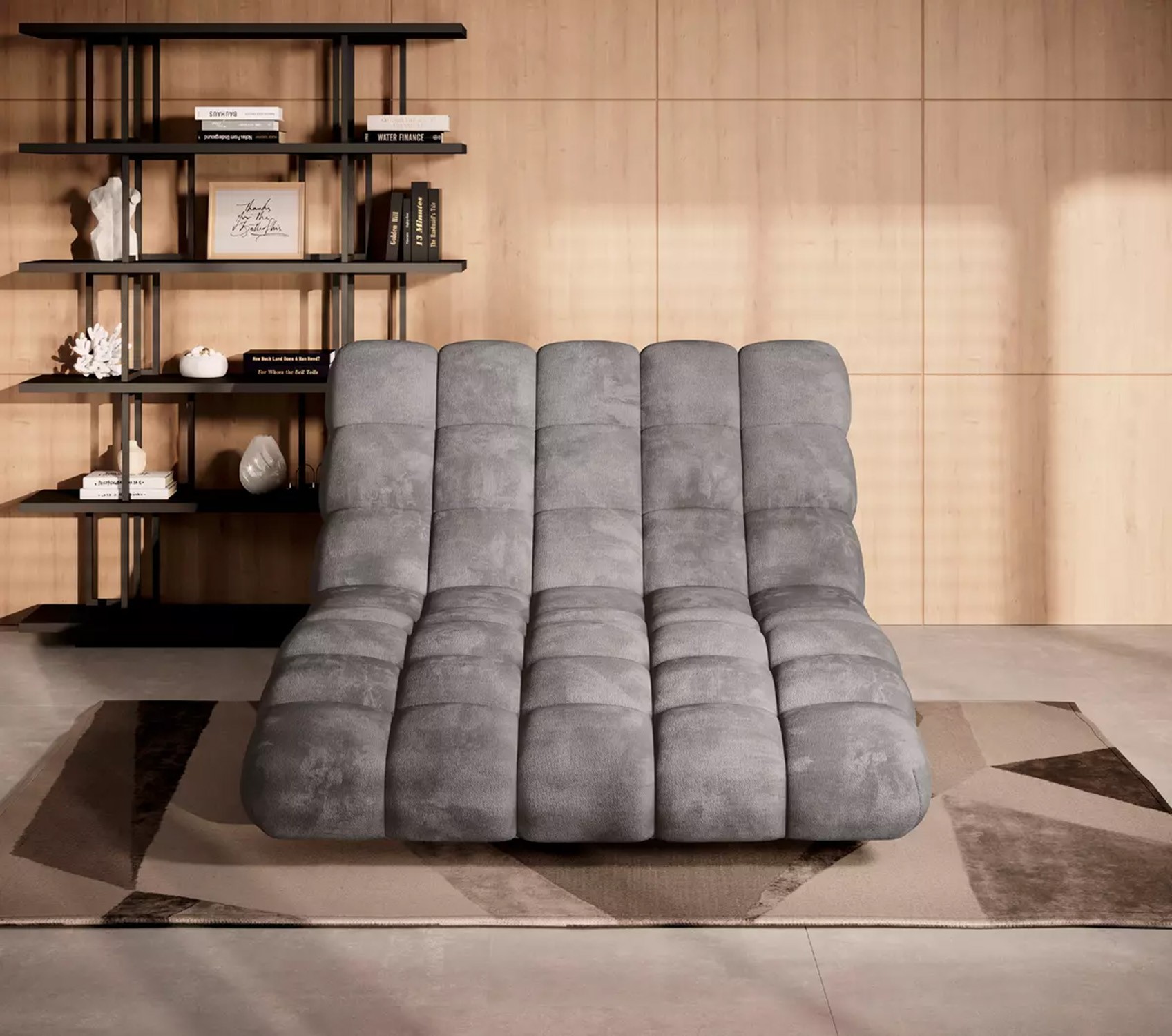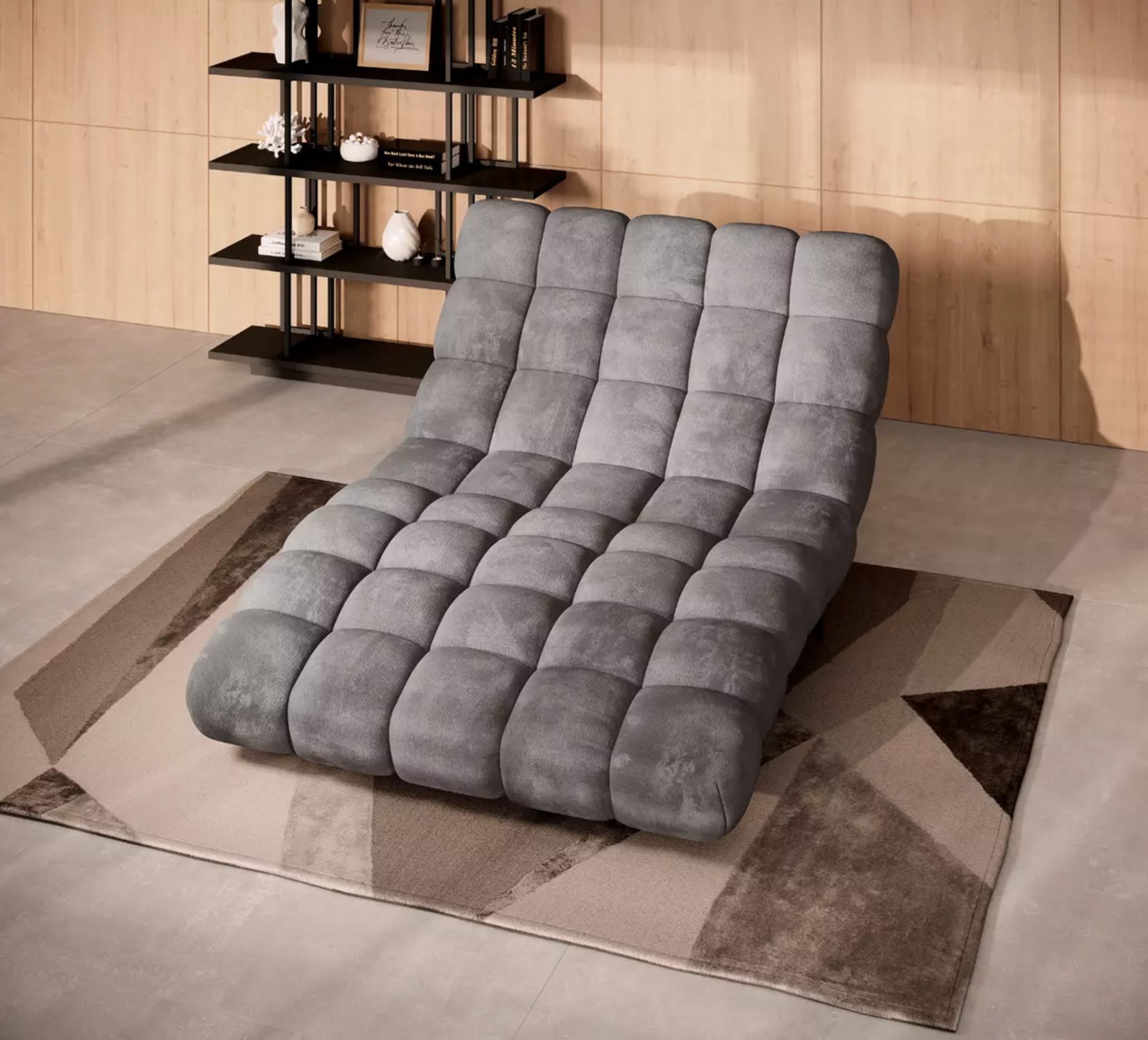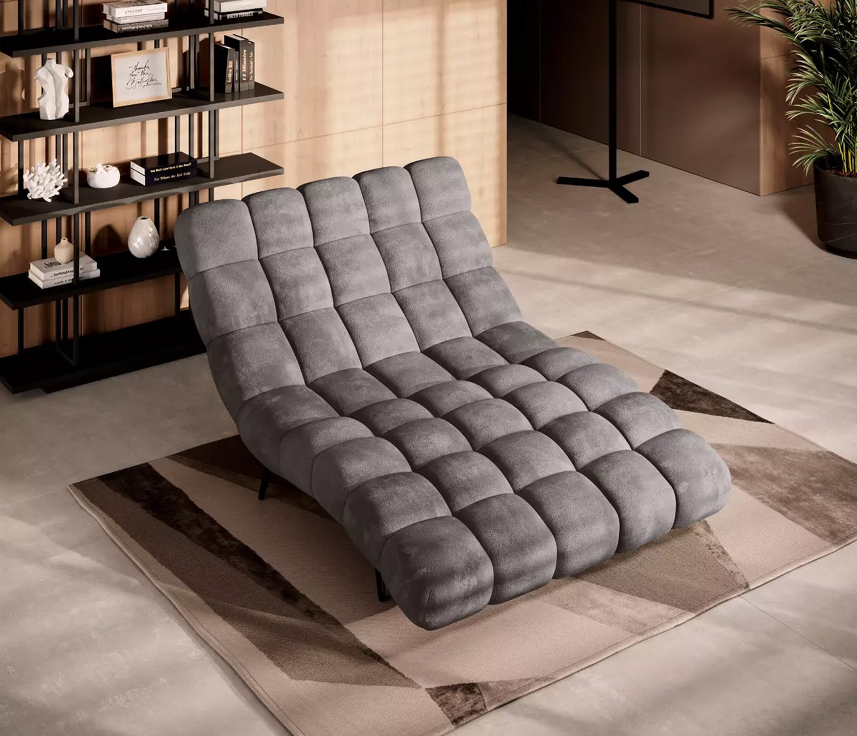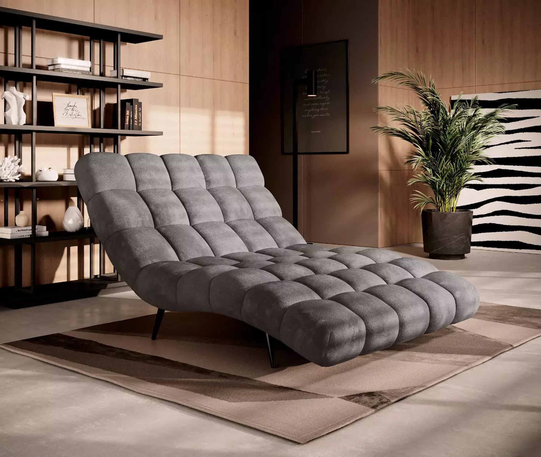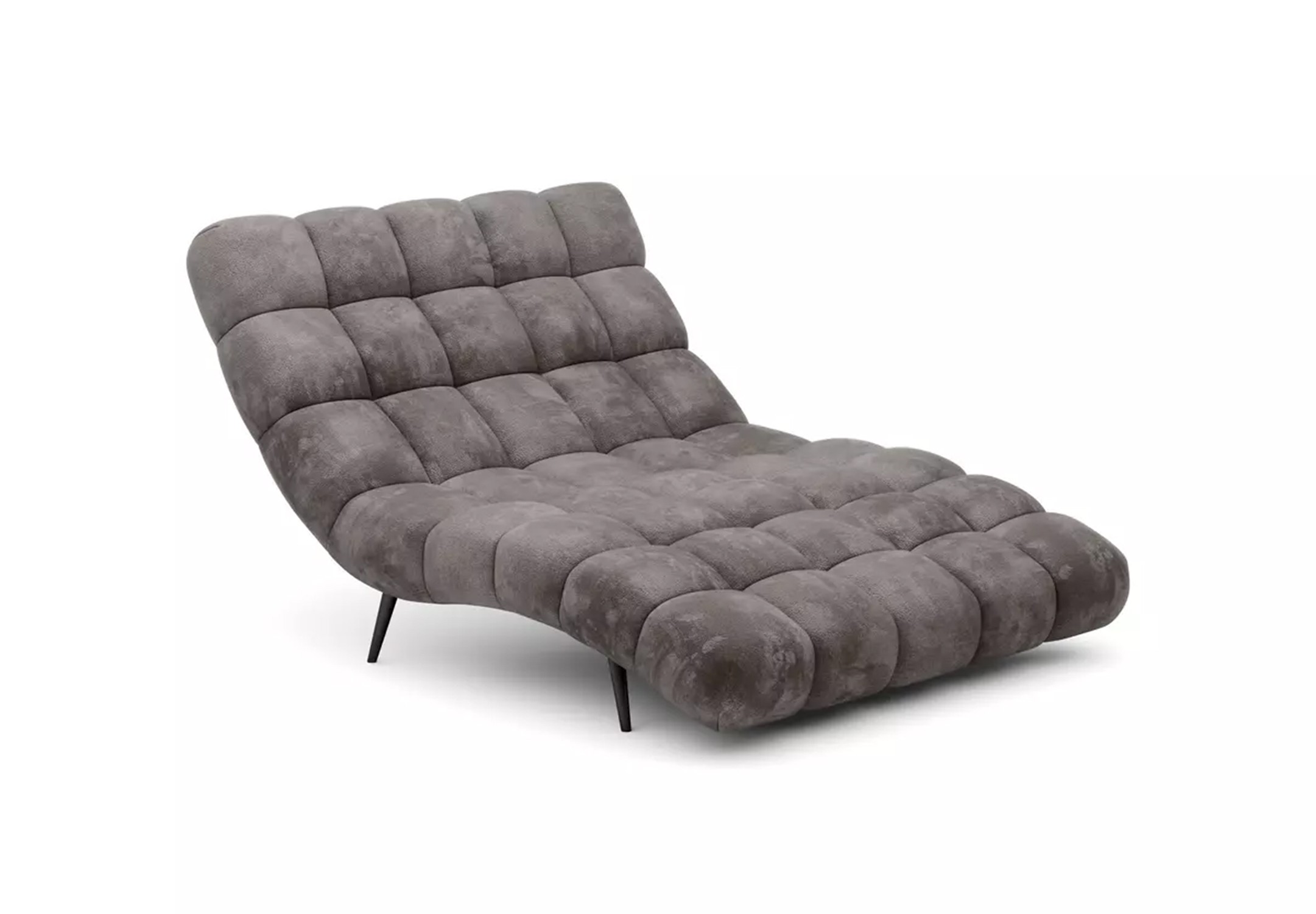 Solidne, czarne nogi nadają całości ponadczasowego charakteru i stabilności, a wykończenie tylnej części tą samą tkaniną sprawia, że szezlong jest meblem wolnostojącym, który prezentuje się efektownie z każdej strony.