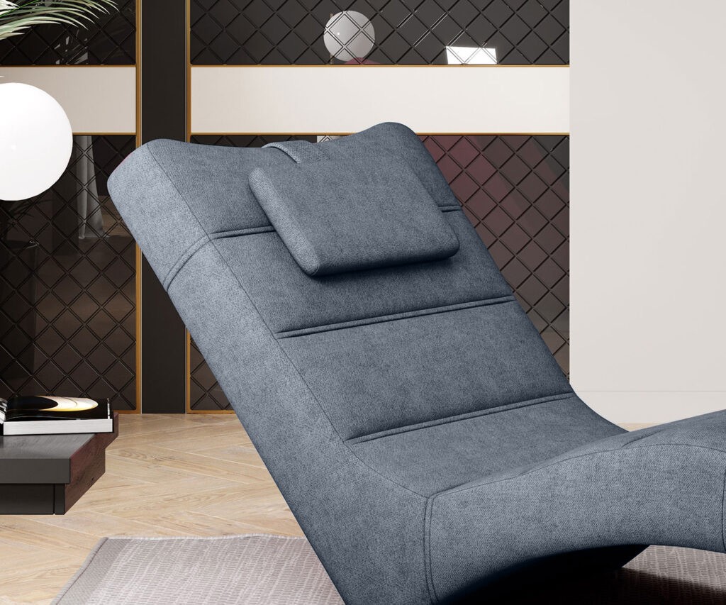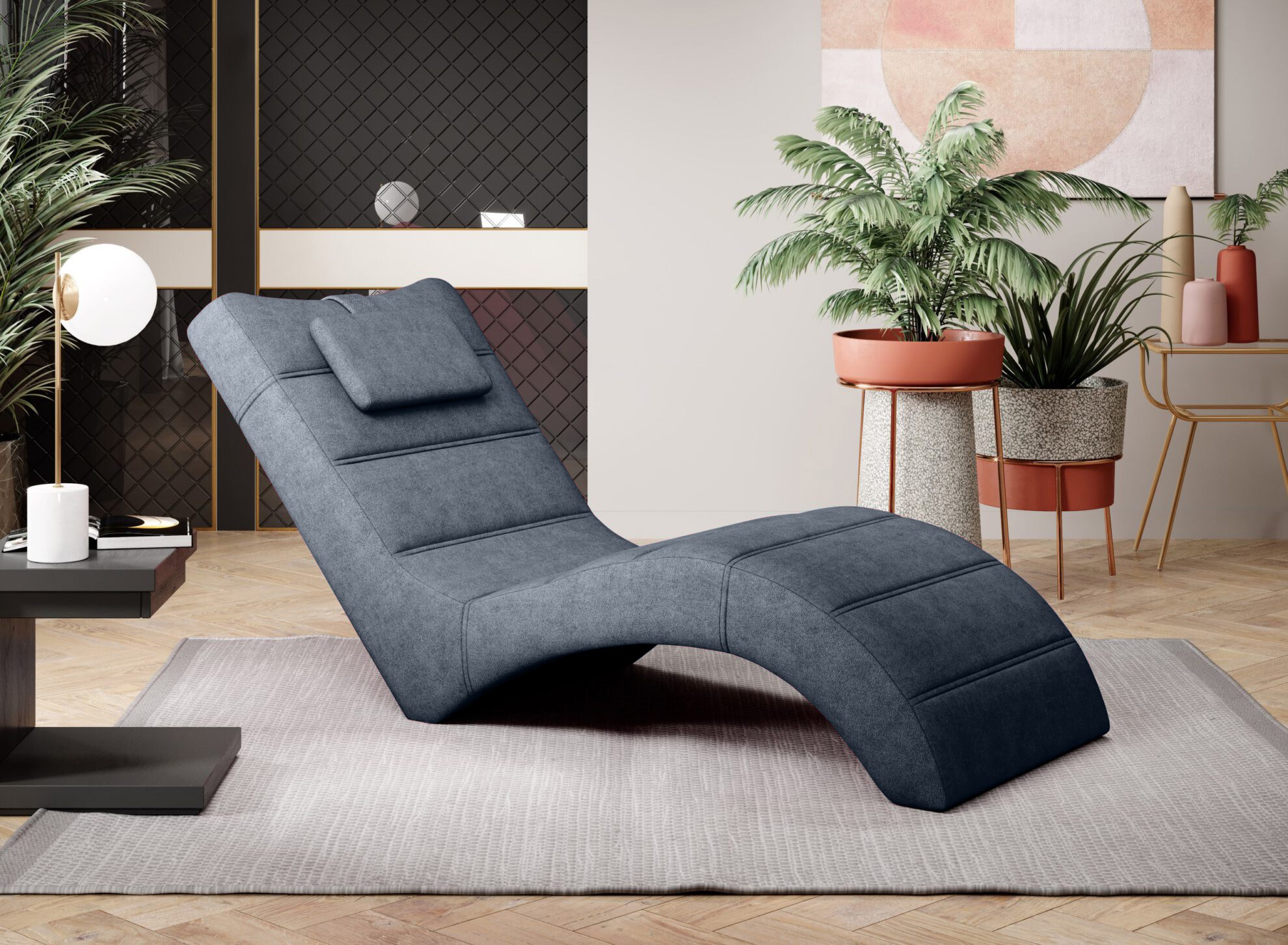 Wykończenie tylnej części tą samą tkaniną sprawia, że szezlong jest meblem wolnostojącym, który prezentuje się efektownie z każdej strony.