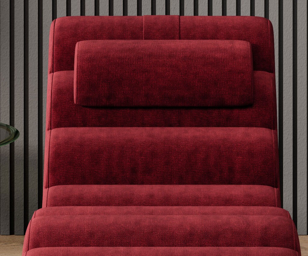 Wykończenie tylnej części tą samą tkaniną sprawia, że szezlong jest meblem wolnostojącym, który prezentuje się efektownie z każdej strony.