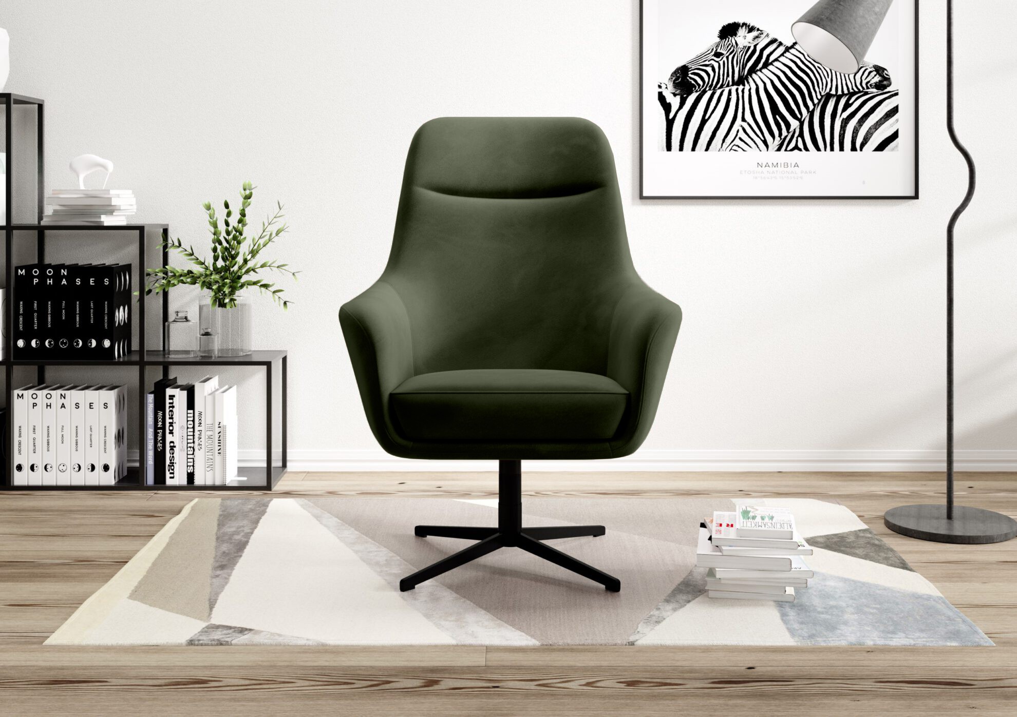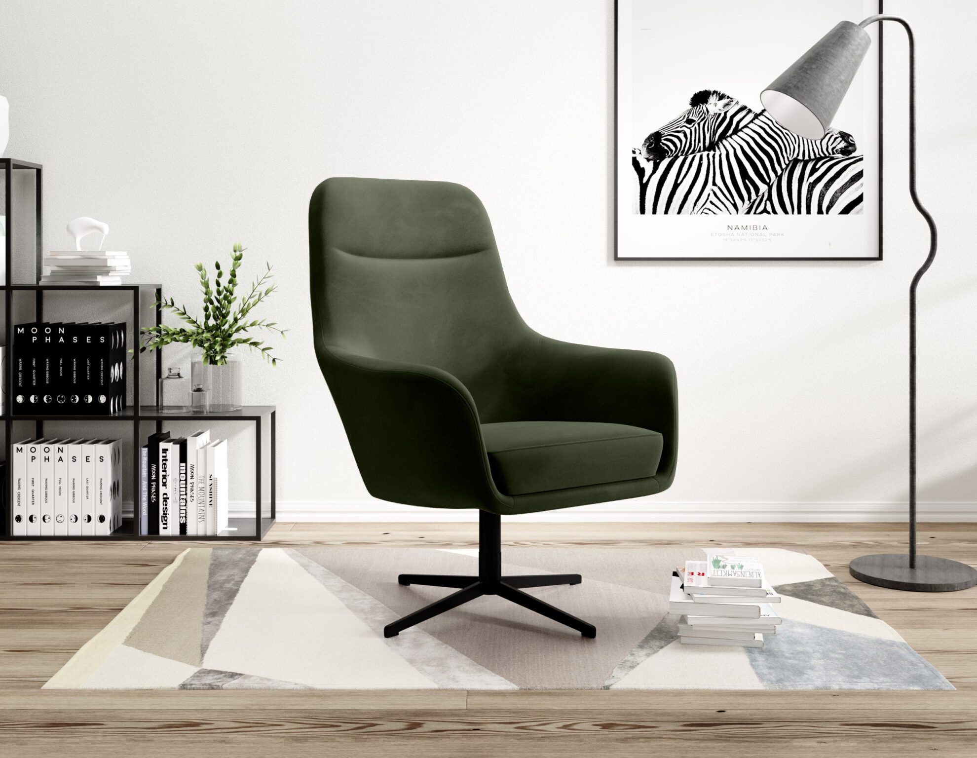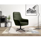 Obrotowa metalowa podstawa 360° zapewnia swobodę ruchu i nowoczesny wygląd, a całość wykończona jest tą samą tkaniną z tyłu, dzięki czemu fotel prezentuje się doskonale z każdej strony i może stać jako mebel wolnostojący.