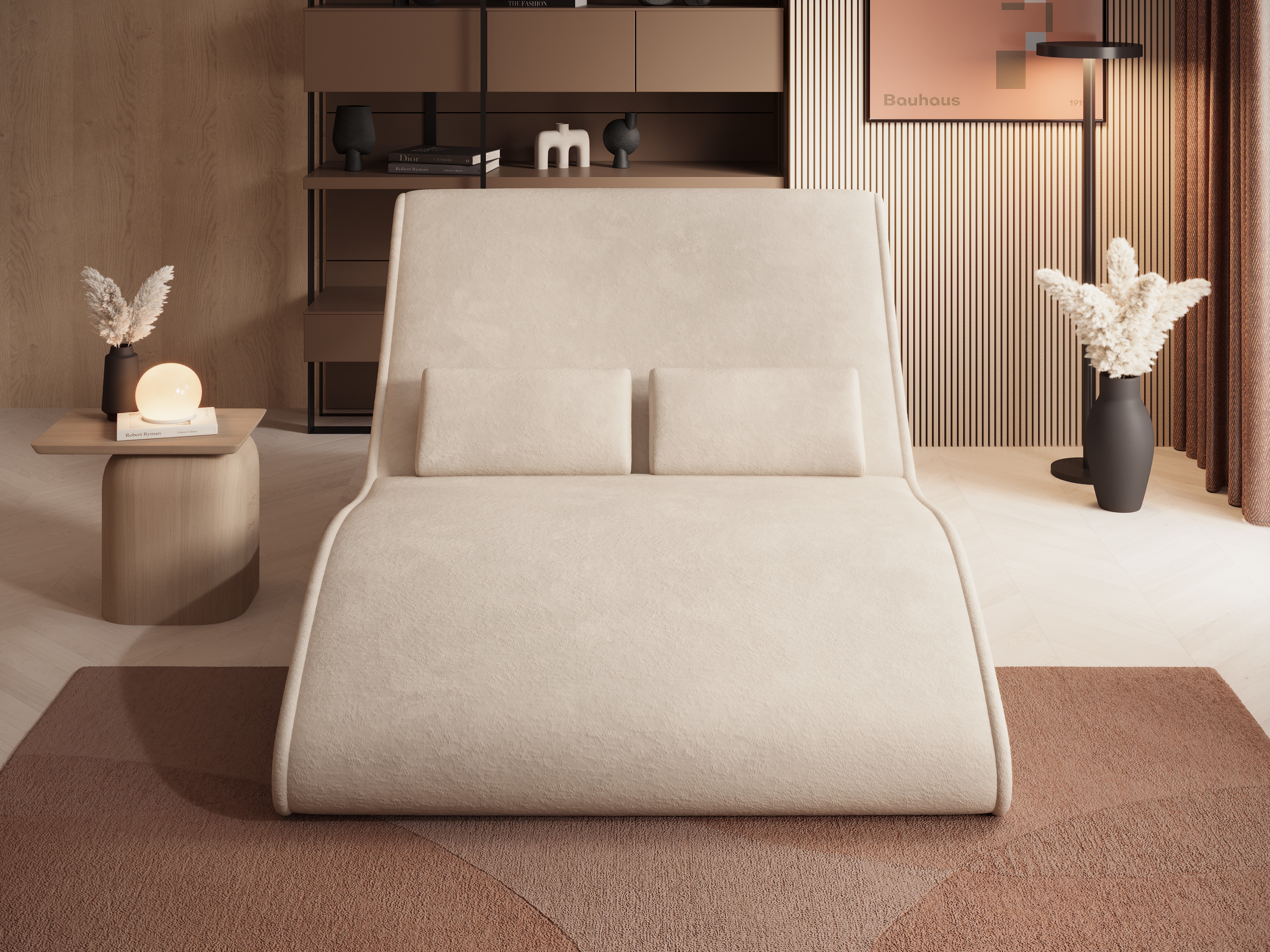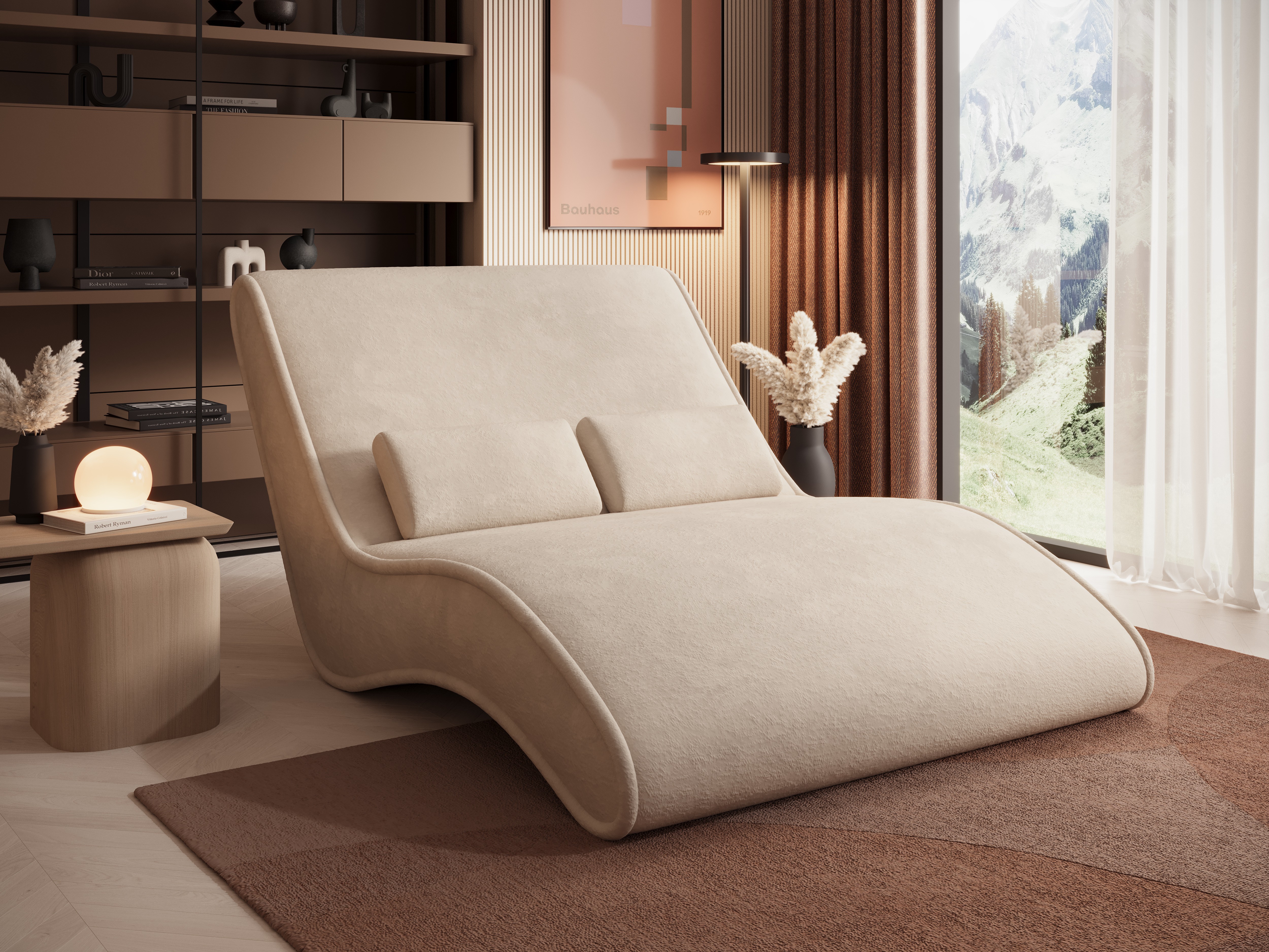 Wykończenie tylnej części tą samą tkaniną sprawia, że szezlong jest meblem wolnostojącym, który prezentuje się efektownie z każdej strony.