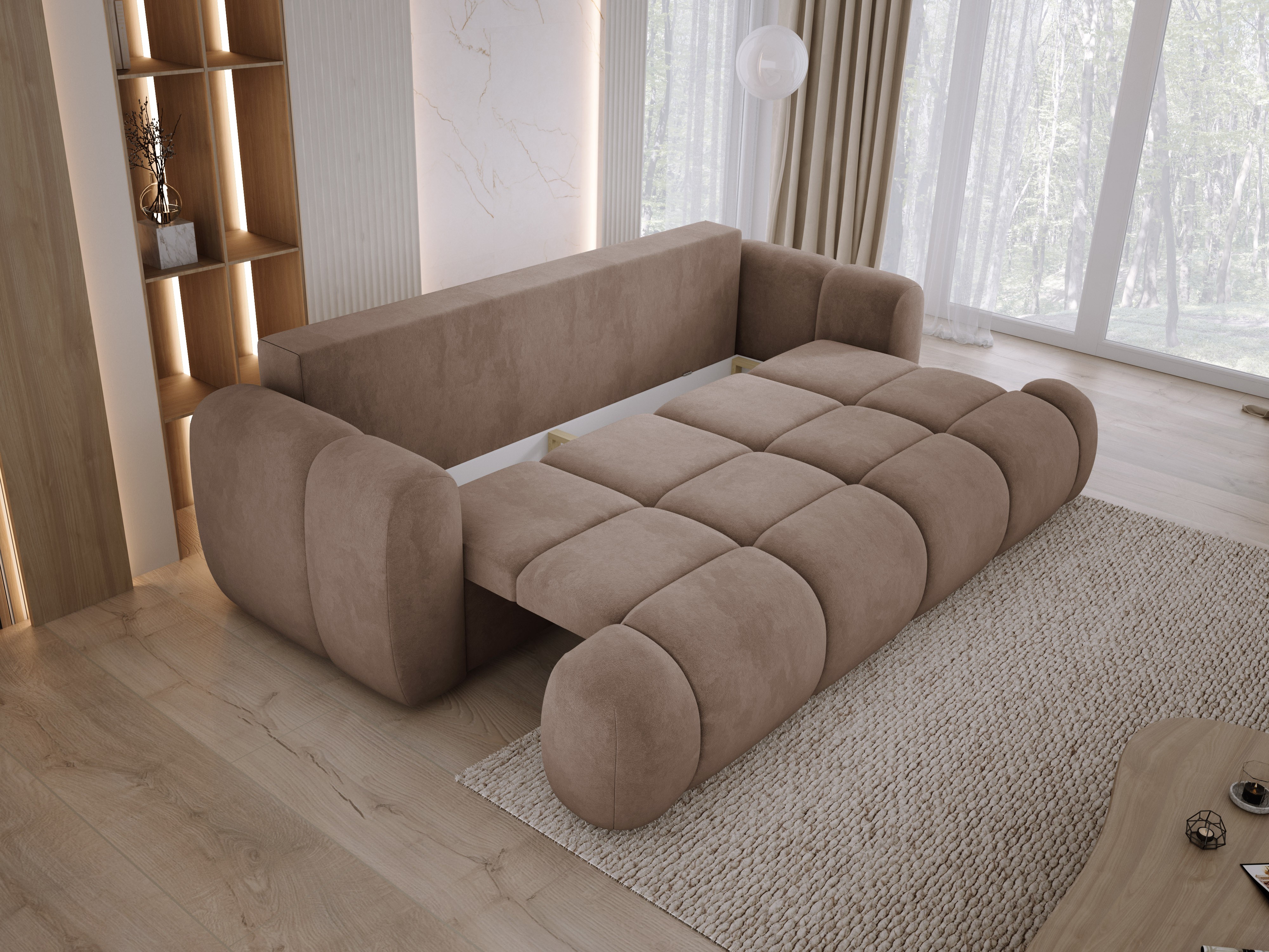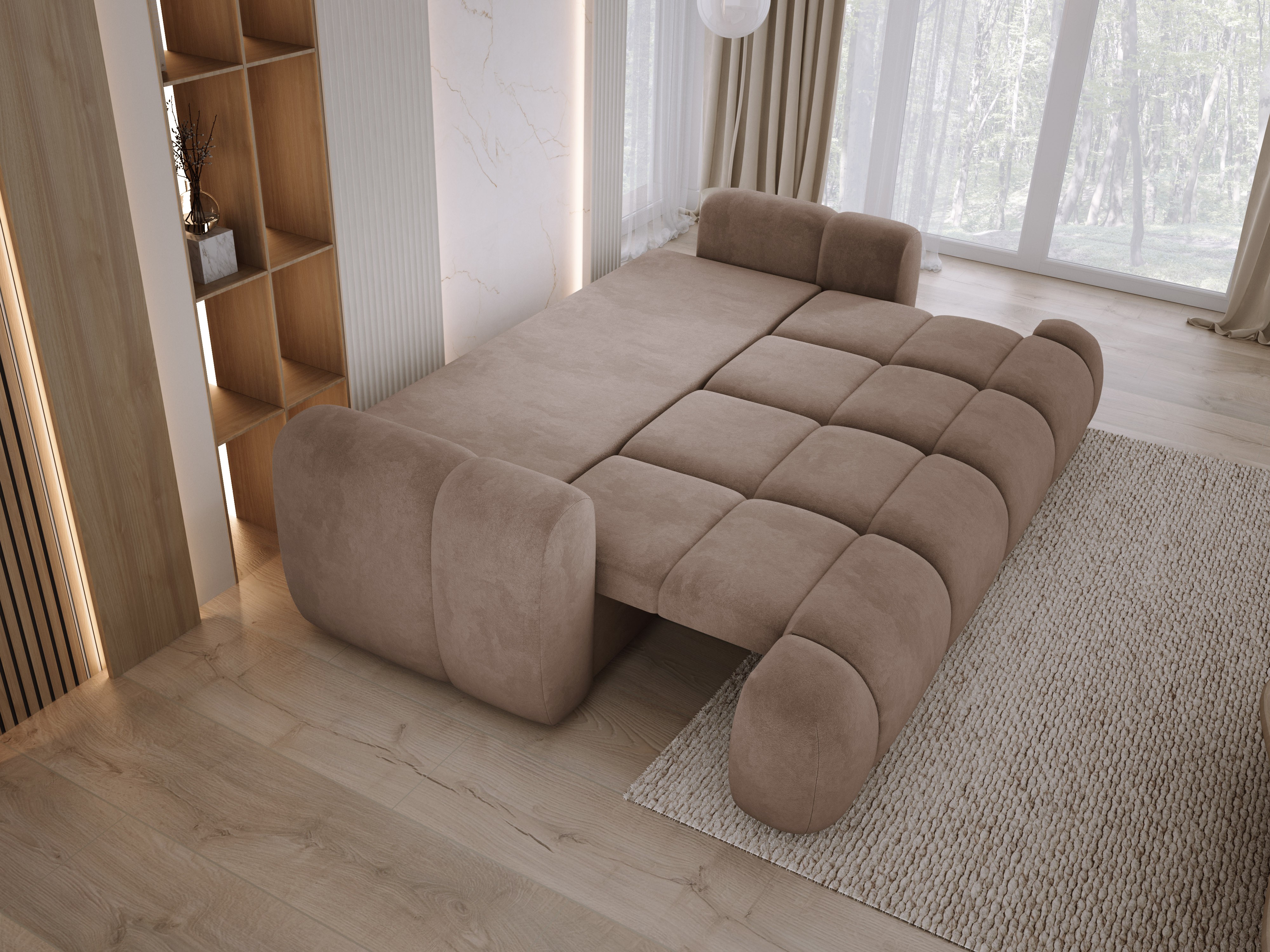 Funkcja spania DL umożliwia szybkie przekształcenie sofy w wygodne łóżko. Wbudowany pojemnik na pościel pozwala przechować wszystko, co potrzebne, by utrzymać porządek.