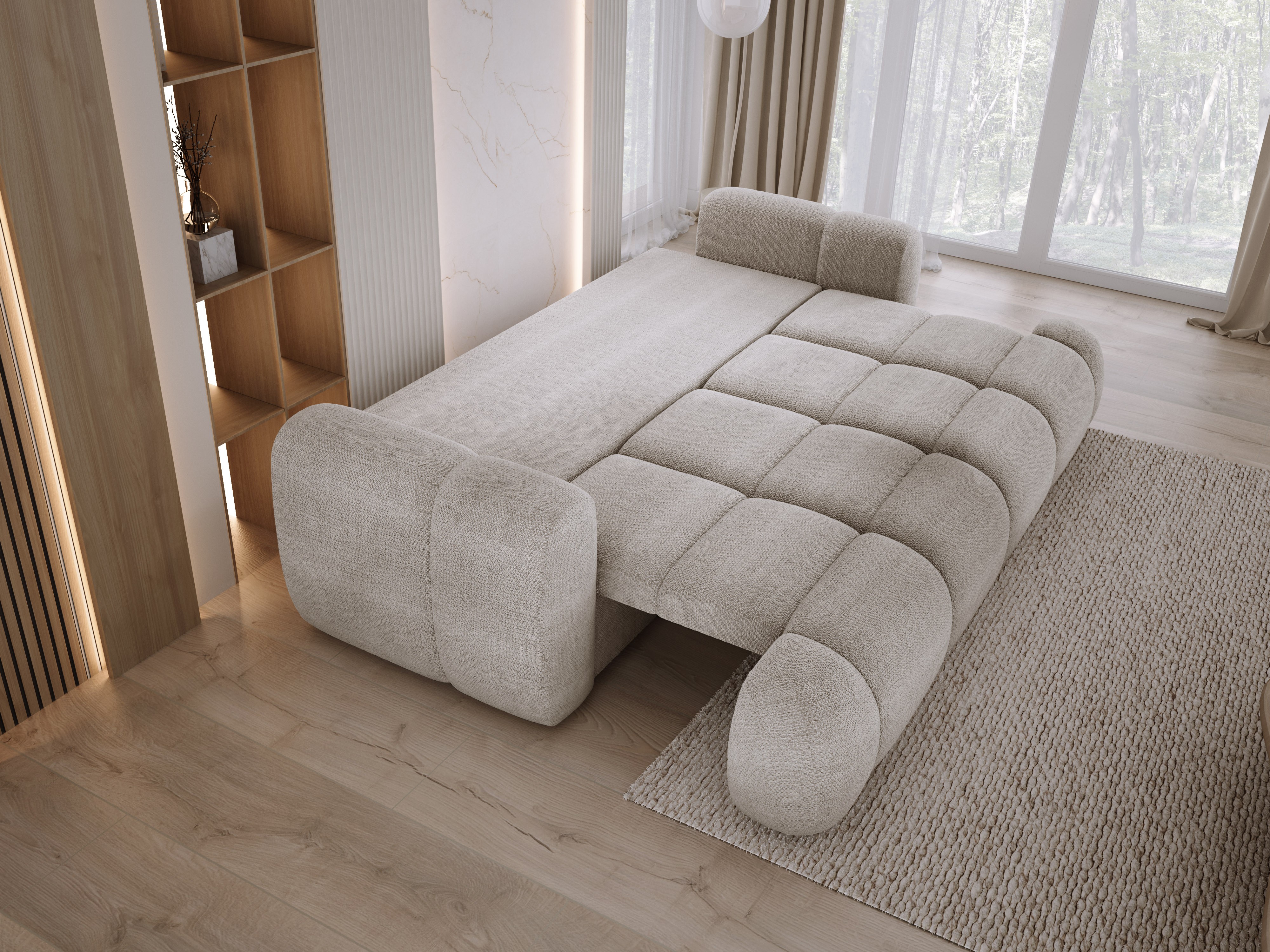 Funkcja spania DL umożliwia szybkie przekształcenie sofy w wygodne łóżko. Wbudowany pojemnik na pościel pozwala przechować wszystko, co potrzebne, by utrzymać porządek.