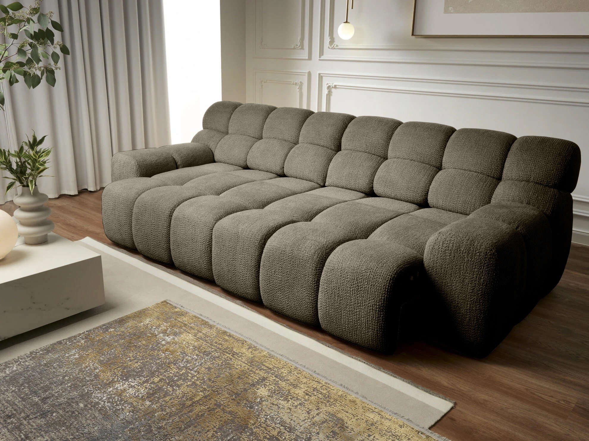 Wyposażona w funkcję spania oraz elektryczną regulację głębokości siedziska , sofa CAMPILE pozwala dopasować komfort wypoczynku do własnych preferencji.