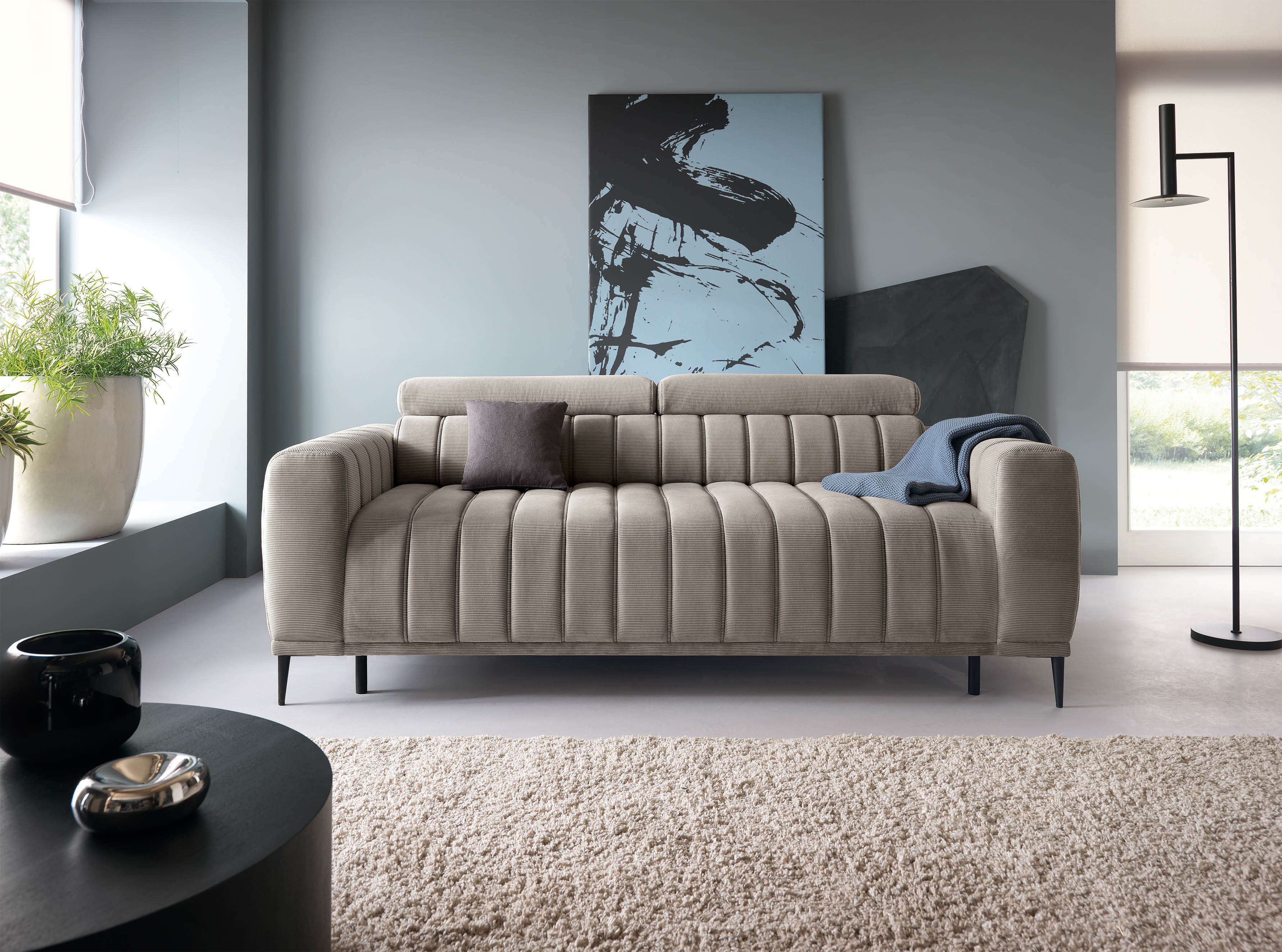 Wysokie, smukłe metalowe nogi dodają meblowi lekkości, a regulowane zagłówki (funkcja RELAX) umożliwiają indywidualne dopasowanie pozycji do potrzeb użytkownika, zapewniając wygodę zarówno podczas siedzenia, jak i relaksu.