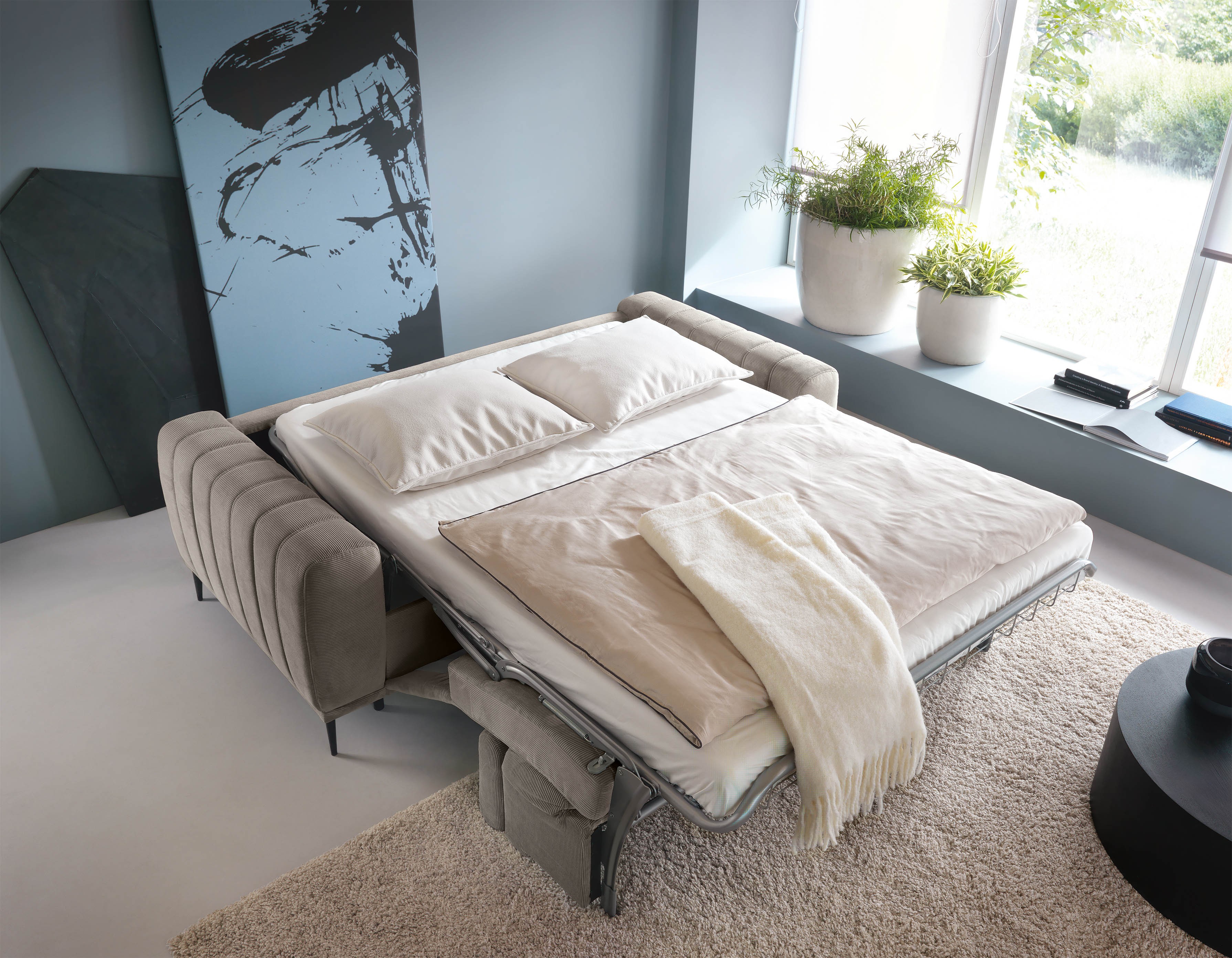 Dzięki włoskiemu systemowi rozkładania, sofa w kilka chwil zmienia się w pełnowymiarowe łóżko z wygodnym materacem o grubości 14 cm – idealne do codziennego użytku, zwłaszcza w mniejszych mieszkaniach lub pokojach młodzieżowych.