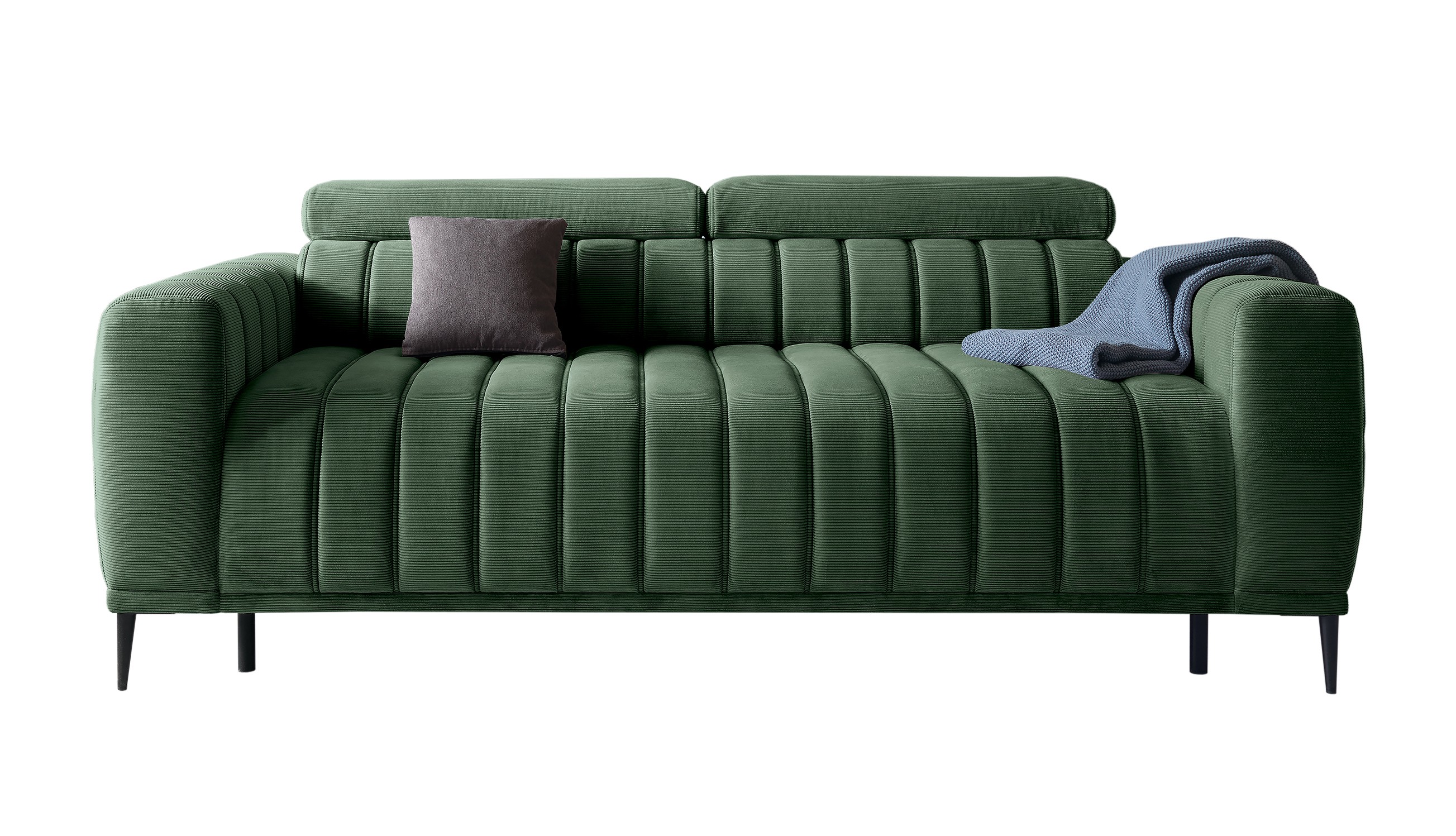 Wysokie, smukłe metalowe nogi dodają meblowi lekkości, a regulowane zagłówki (funkcja RELAX) umożliwiają indywidualne dopasowanie pozycji do potrzeb użytkownika, zapewniając wygodę zarówno podczas siedzenia, jak i relaksu.