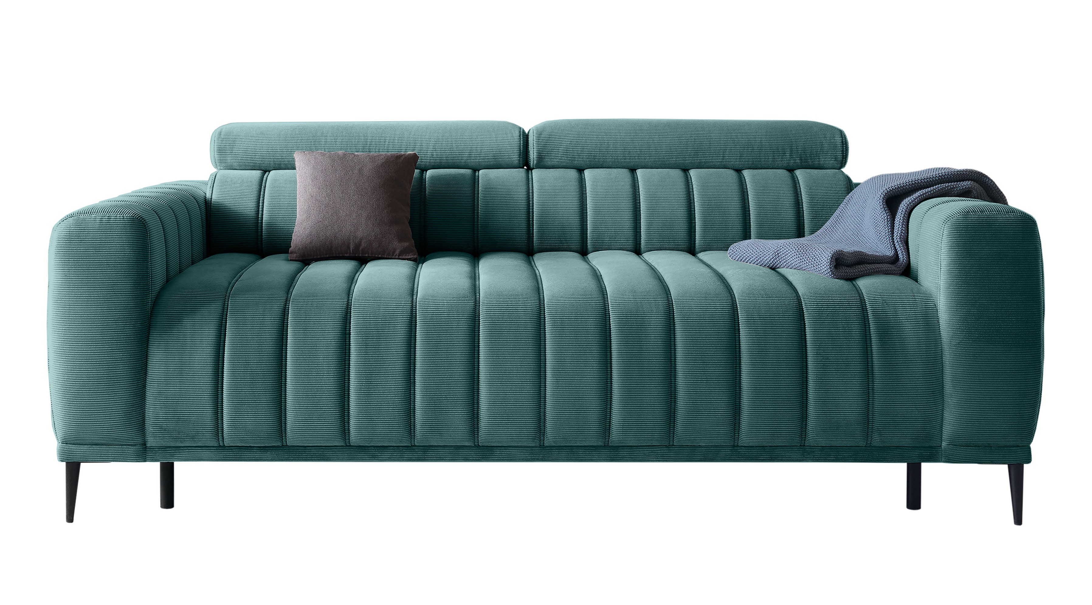 Wysokie, smukłe metalowe nogi dodają meblowi lekkości, a regulowane zagłówki (funkcja RELAX) umożliwiają indywidualne dopasowanie pozycji do potrzeb użytkownika, zapewniając wygodę zarówno podczas siedzenia, jak i relaksu.