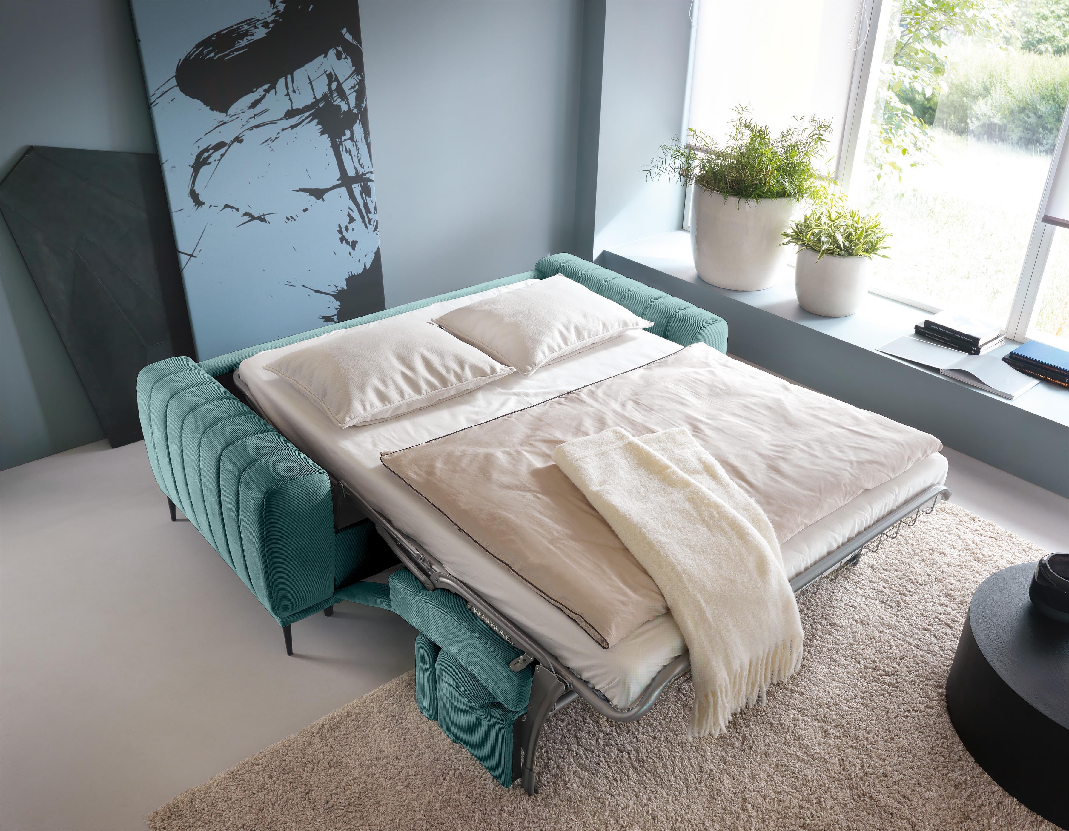 Dzięki włoskiemu systemowi rozkładania, sofa w kilka chwil zmienia się w pełnowymiarowe łóżko z wygodnym materacem o grubości 14 cm – idealne do codziennego użytku, zwłaszcza w mniejszych mieszkaniach lub pokojach młodzieżowych.