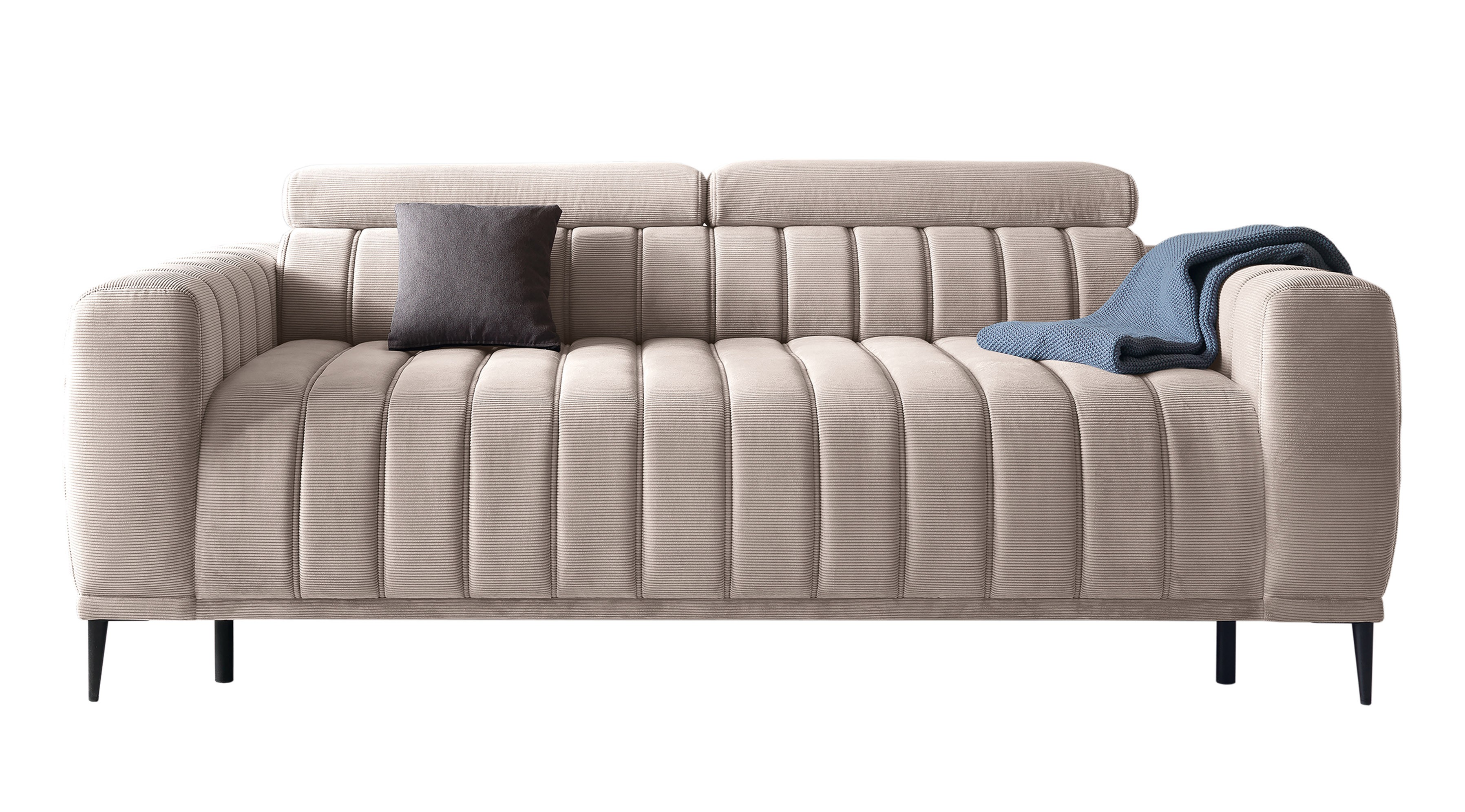 Wysokie, smukłe metalowe nogi dodają meblowi lekkości, a regulowane zagłówki (funkcja RELAX) umożliwiają indywidualne dopasowanie pozycji do potrzeb użytkownika, zapewniając wygodę zarówno podczas siedzenia, jak i relaksu.