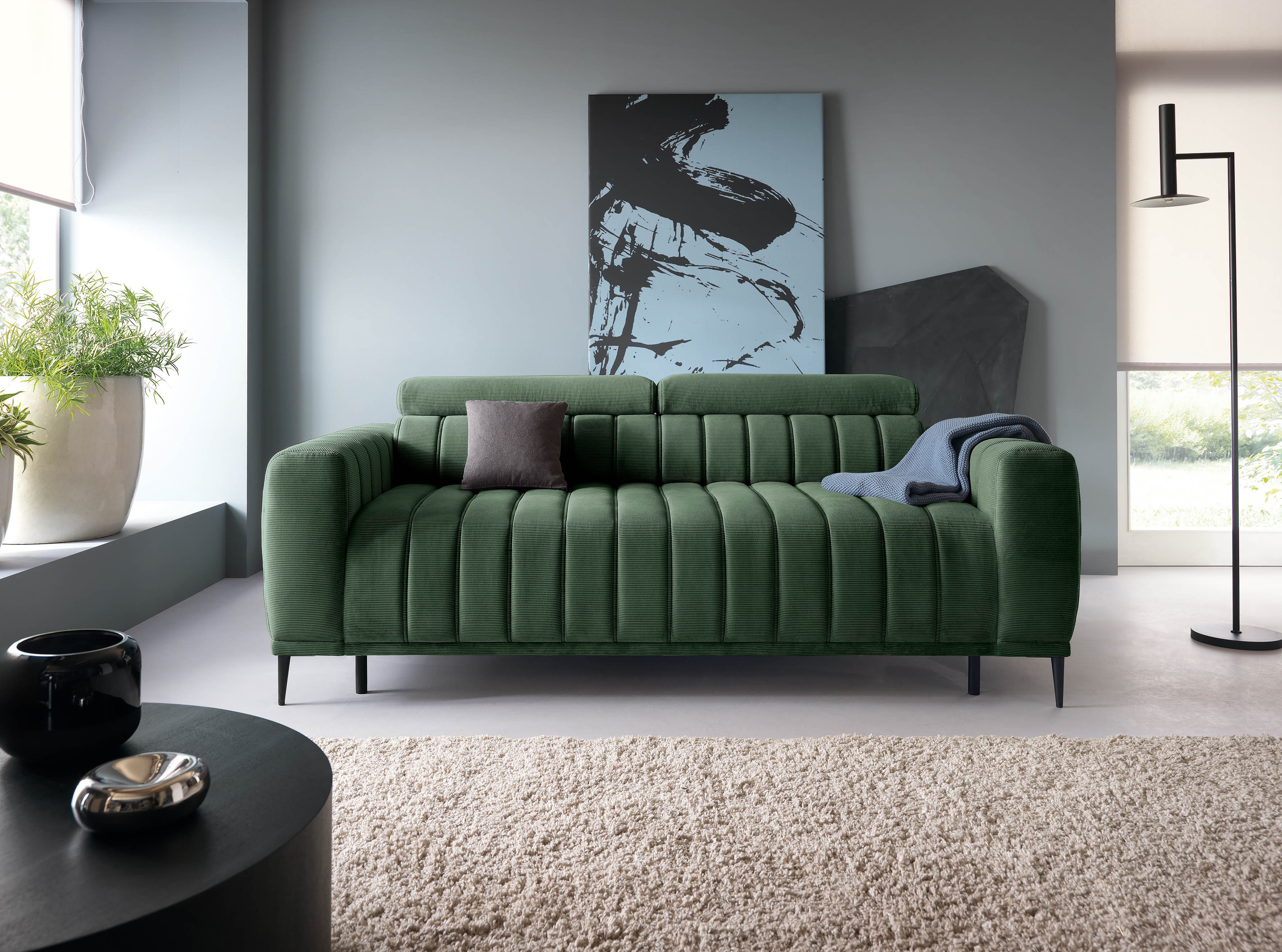 Wysokie, smukłe metalowe nogi dodają meblowi lekkości, a regulowane zagłówki (funkcja RELAX) umożliwiają indywidualne dopasowanie pozycji do potrzeb użytkownika, zapewniając wygodę zarówno podczas siedzenia, jak i relaksu.