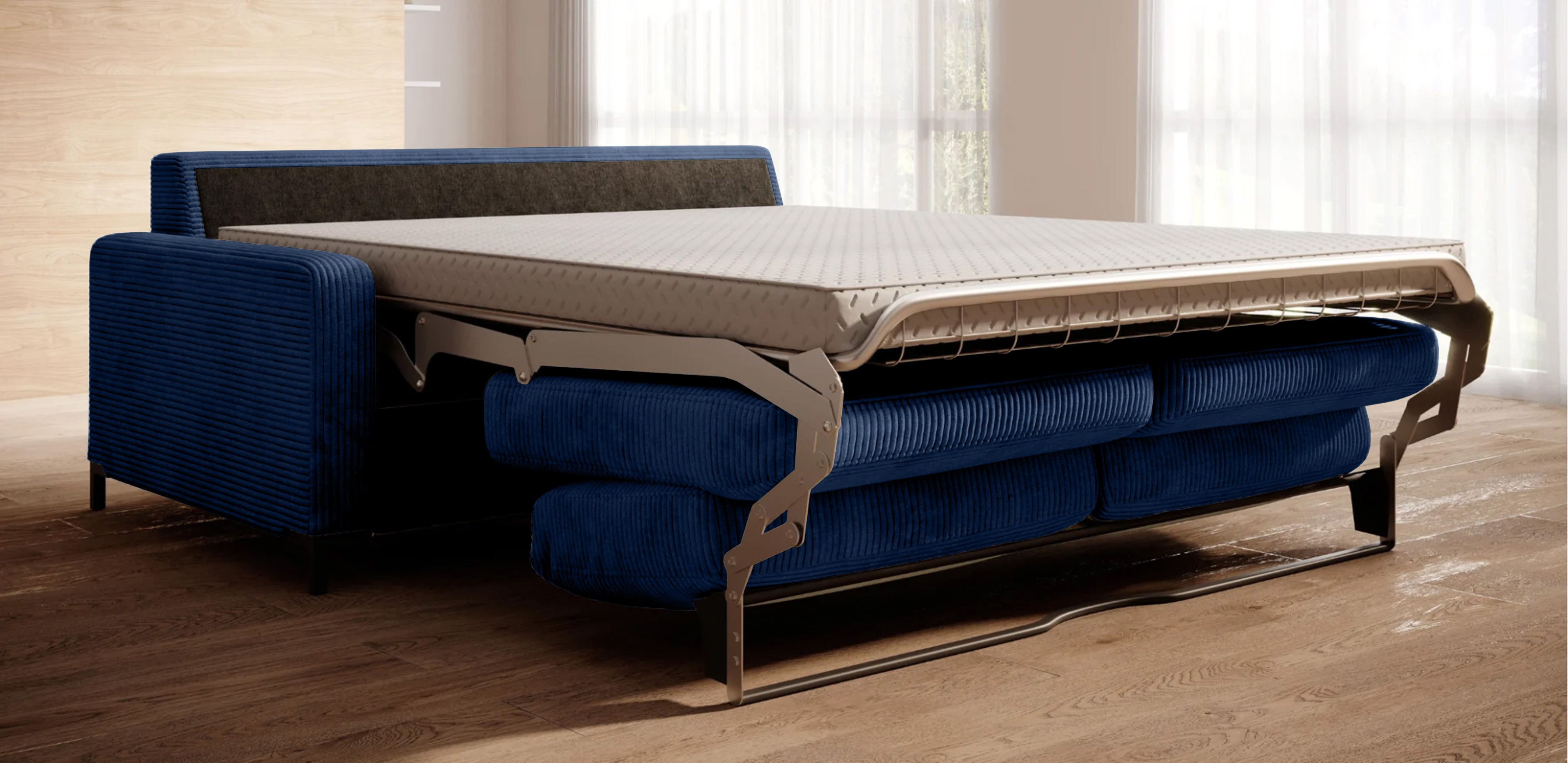 Nowoczesny system rozkładania RAPID (włoski stelaż) zapewnia błyskawiczne i wygodne rozkładanie, przekształcając sofę w pełnowymiarowe łóżko z materacem.