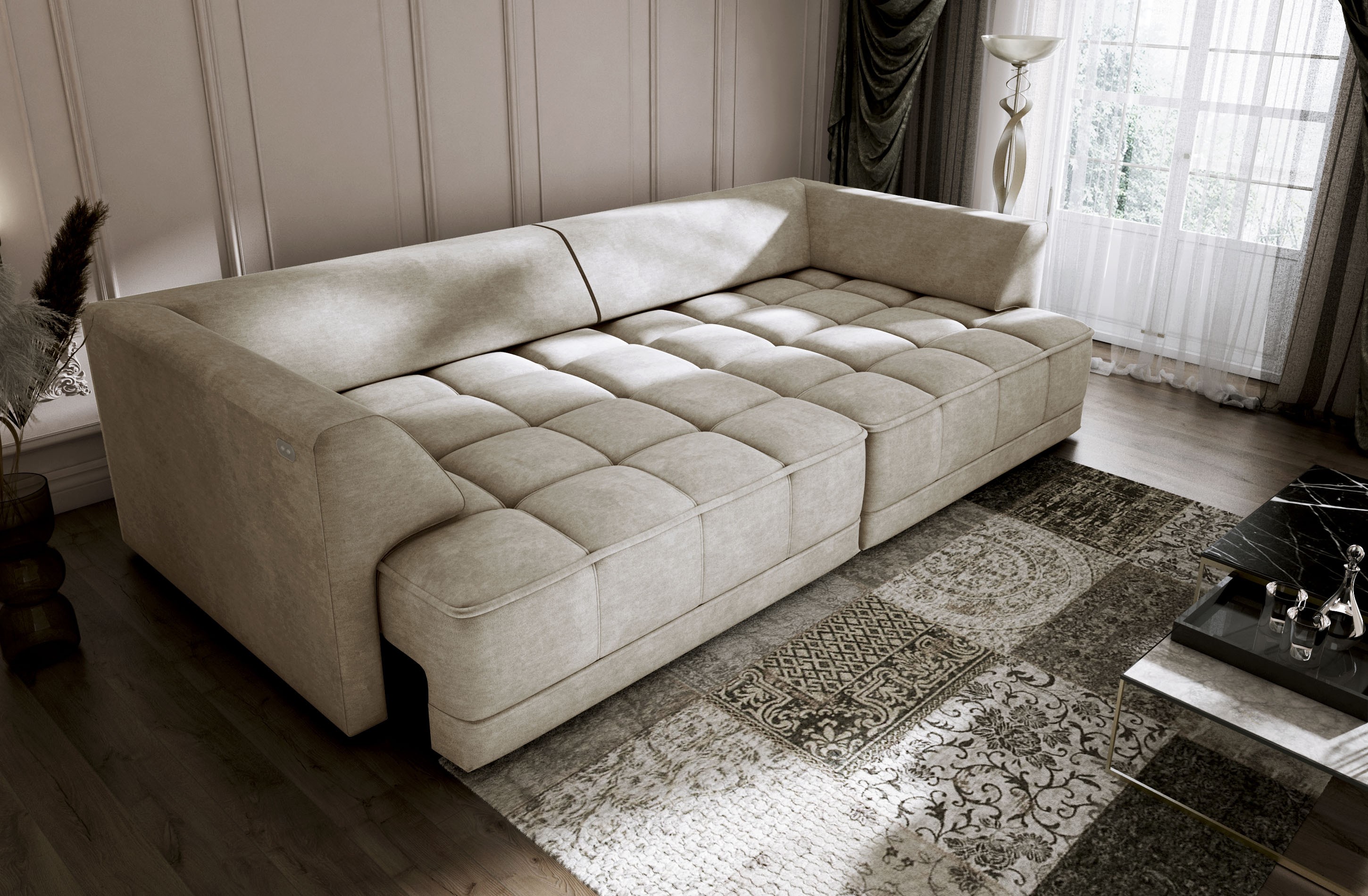 Elektrycznie wysuwane siedzisko (do 27 cm) pozwala w łatwy sposób dostosować sofę do swoich potrzeb – tworząc przestrzeń do odpoczynku, drzemki lub wieczornego relaksu.