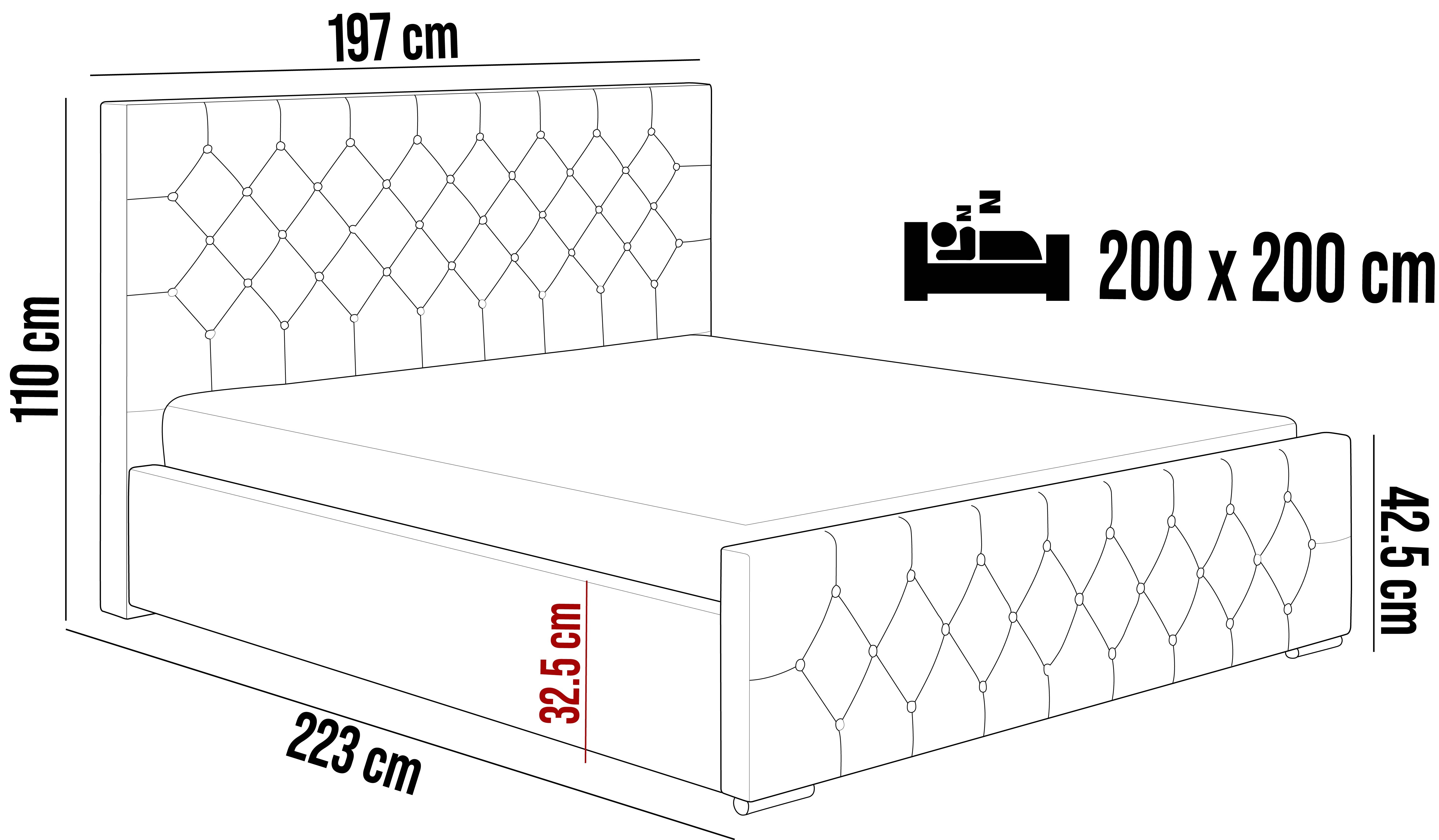 Model wyposażony jest w wysokie, wygodne wezgłowie oraz ozdobny front z przeszyciami w stylu Caro i pikowaniami z kryształkami, które nadają całości elegancki, nowoczesny charakter. Stylowy zagłówek zaprojektowano tak, aby harmonijnie współgrał z bryłą łóżka i pasował do różnych aranżacji sypialni. Tył zagłówka wykończono czarną podbitką – łóżko nie jest wolnostojące.