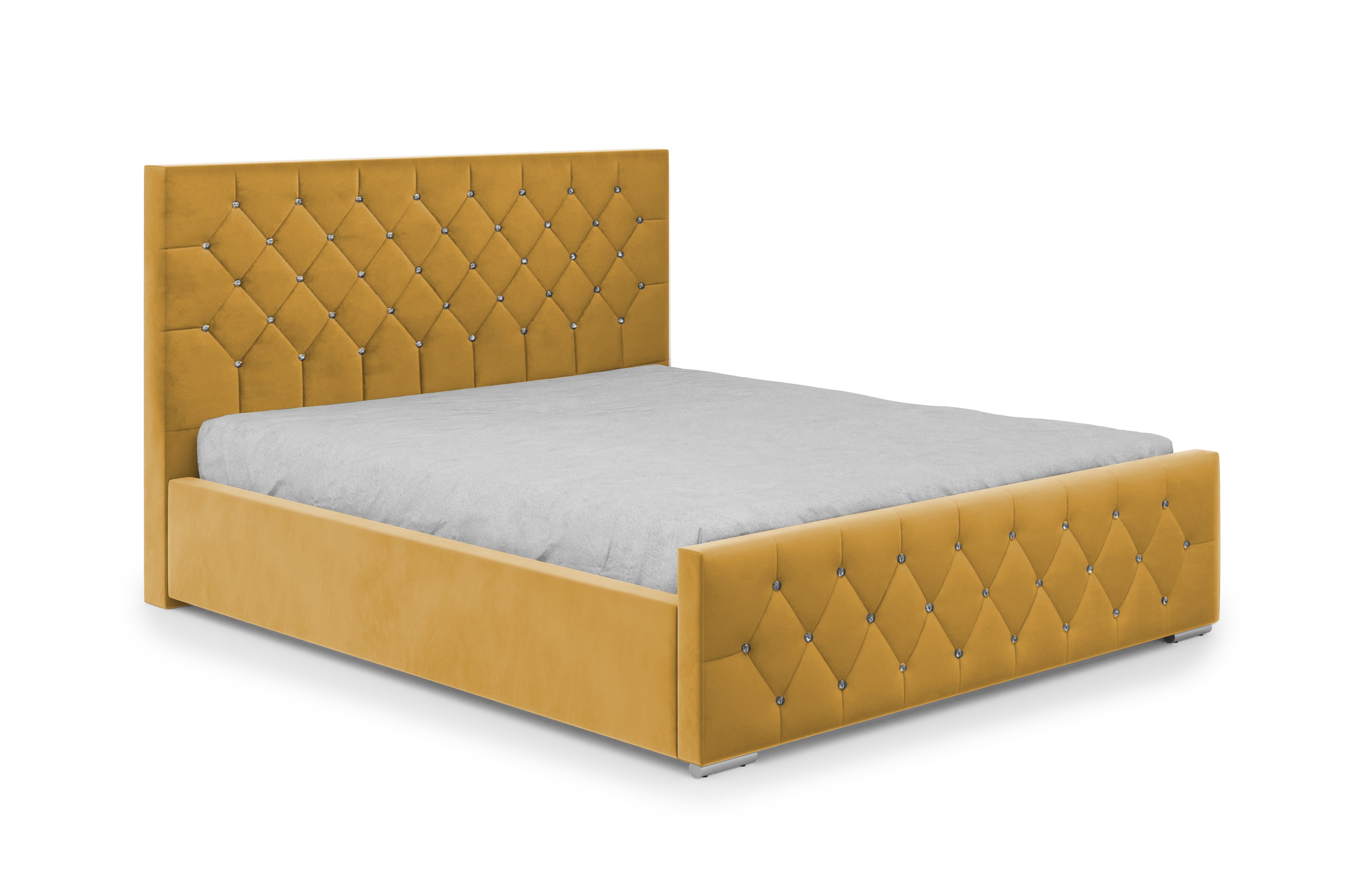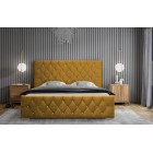 Model wyposażony jest w wysokie, wygodne wezgłowie oraz ozdobny front z przeszyciami w stylu Caro i pikowaniami z kryształkami, które nadają całości elegancki, nowoczesny charakter. Stylowy zagłówek zaprojektowano tak, aby harmonijnie współgrał z bryłą łóżka i pasował do różnych aranżacji sypialni. Tył zagłówka wykończono czarną podbitką – łóżko nie jest wolnostojące.