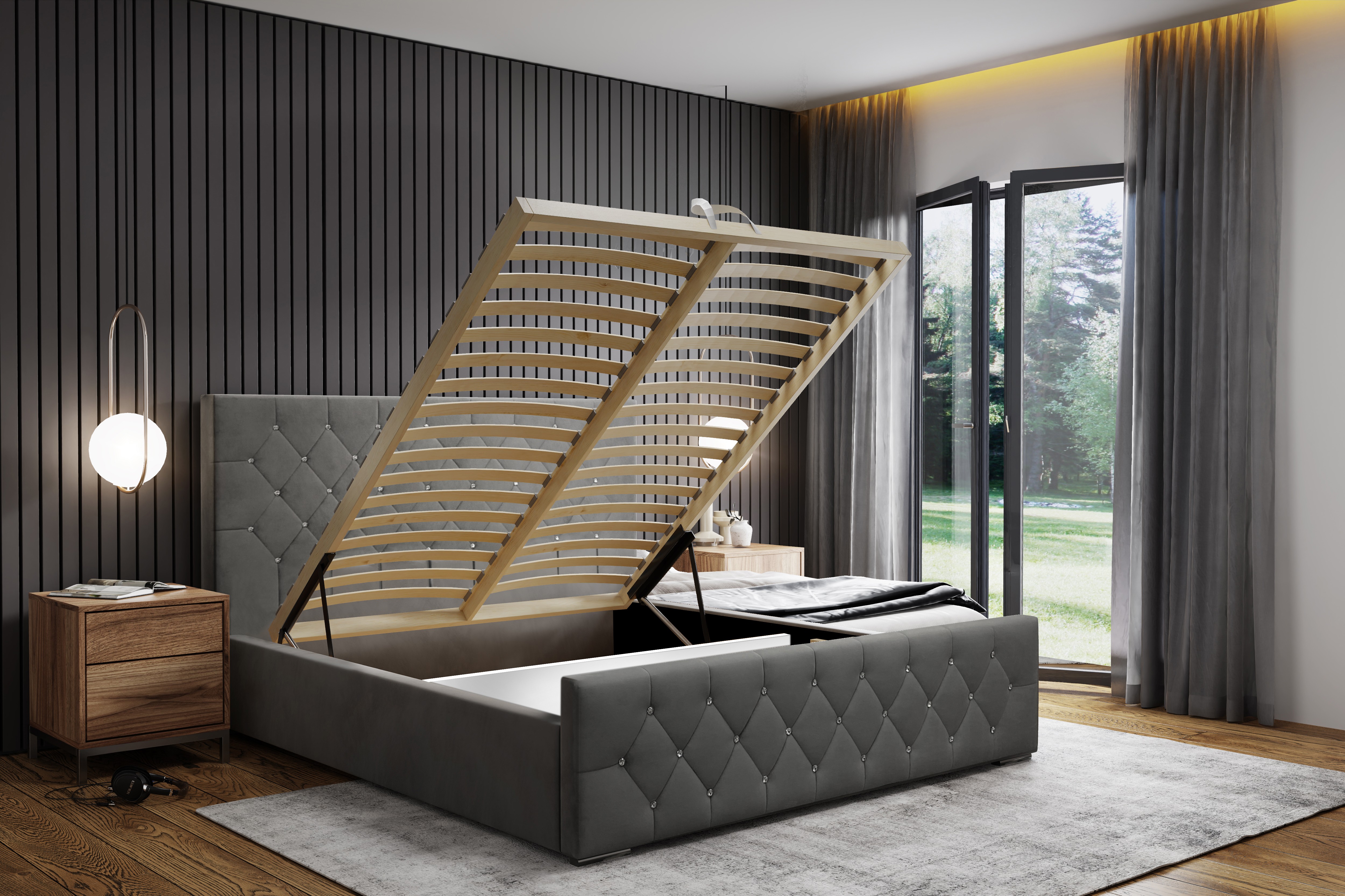 Model wyposażony jest w wysokie, wygodne wezgłowie oraz ozdobny front z przeszyciami w stylu Caro i pikowaniami z kryształkami, które nadają całości elegancki, nowoczesny charakter. Stylowy zagłówek zaprojektowano tak, aby harmonijnie współgrał z bryłą łóżka i pasował do różnych aranżacji sypialni. Tył zagłówka wykończono czarną podbitką – łóżko nie jest wolnostojące.