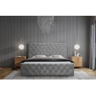 Model wyposażony jest w wysokie, wygodne wezgłowie oraz ozdobny front z przeszyciami w stylu Caro i pikowaniami z kryształkami, które nadają całości elegancki, nowoczesny charakter. Stylowy zagłówek zaprojektowano tak, aby harmonijnie współgrał z bryłą łóżka i pasował do różnych aranżacji sypialni. Tył zagłówka wykończono czarną podbitką – łóżko nie jest wolnostojące.
