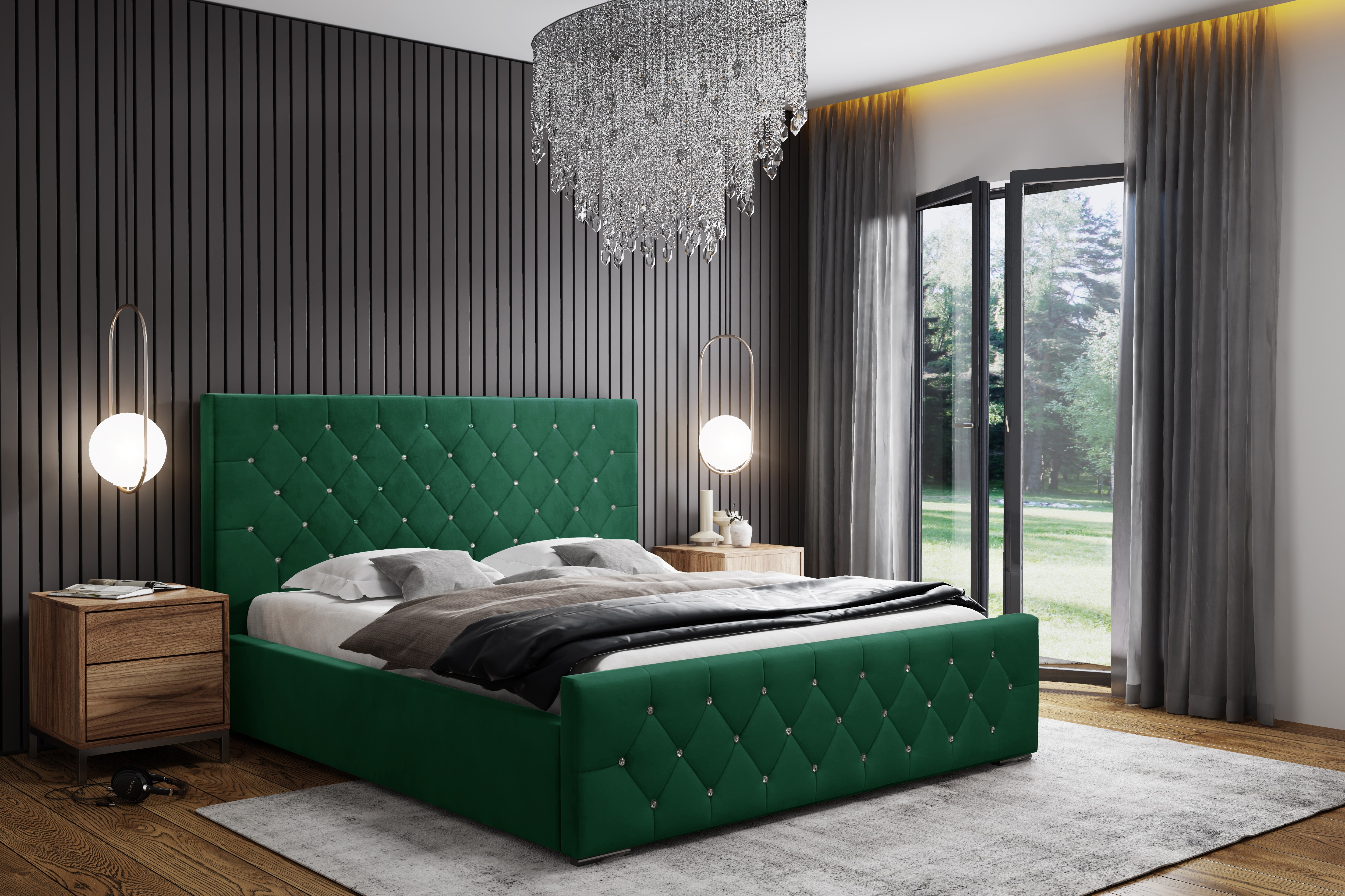 Model wyposażony jest w wysokie, wygodne wezgłowie oraz ozdobny front z przeszyciami w stylu Caro i pikowaniami z kryształkami, które nadają całości elegancki, nowoczesny charakter. Stylowy zagłówek zaprojektowano tak, aby harmonijnie współgrał z bryłą łóżka i pasował do różnych aranżacji sypialni. Tył zagłówka wykończono czarną podbitką – łóżko nie jest wolnostojące.