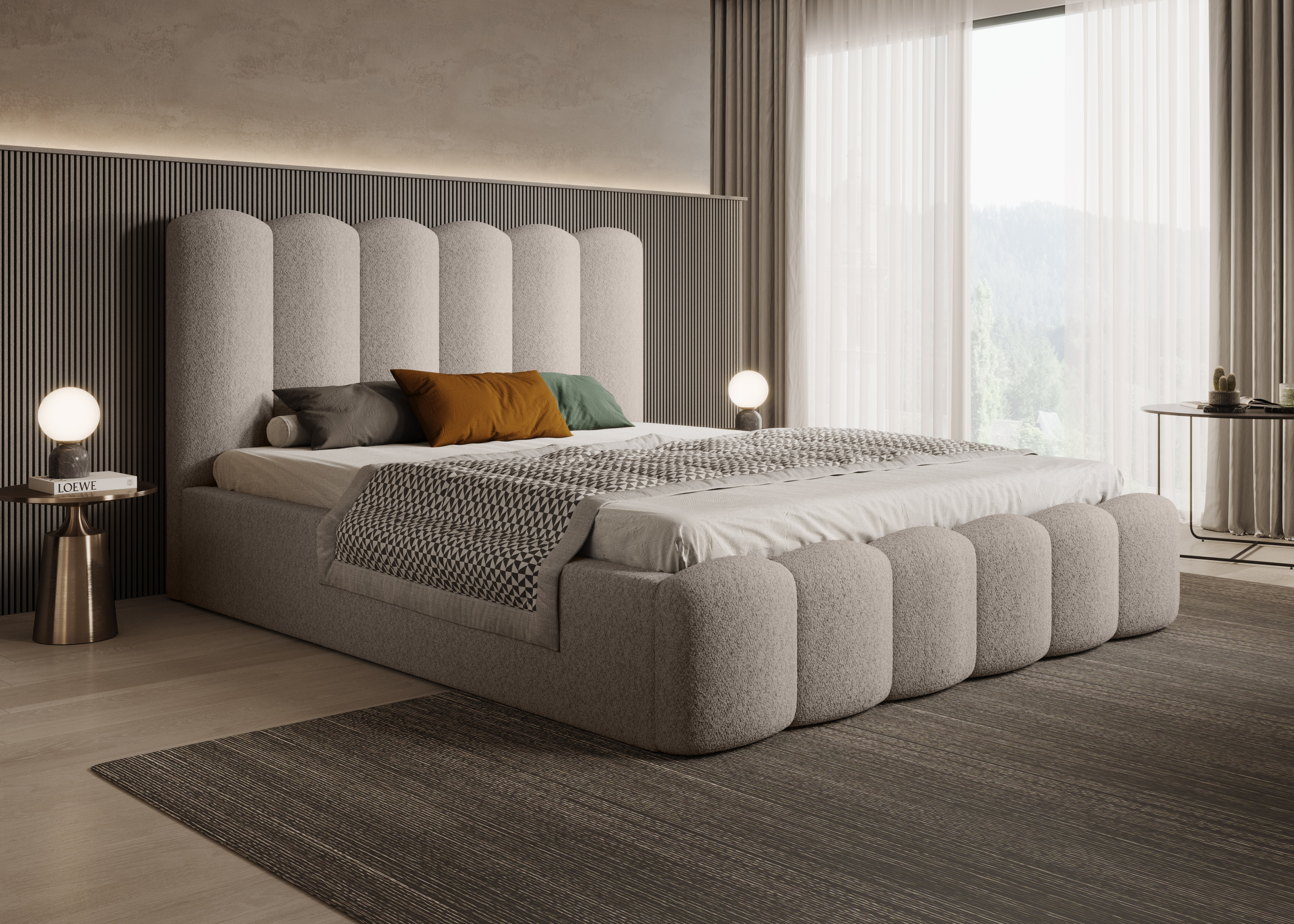 Łóżko tapicerowane Mona V łączy stylową estetykę z wysoką funkcjonalnością, tworząc idealne rozwiązanie do nowoczesnej sypialni. Wysokie, tapicerowane wezgłowie oraz ozdobny front z półwałkami nadają bryle elegancki i wyrazisty charakter.