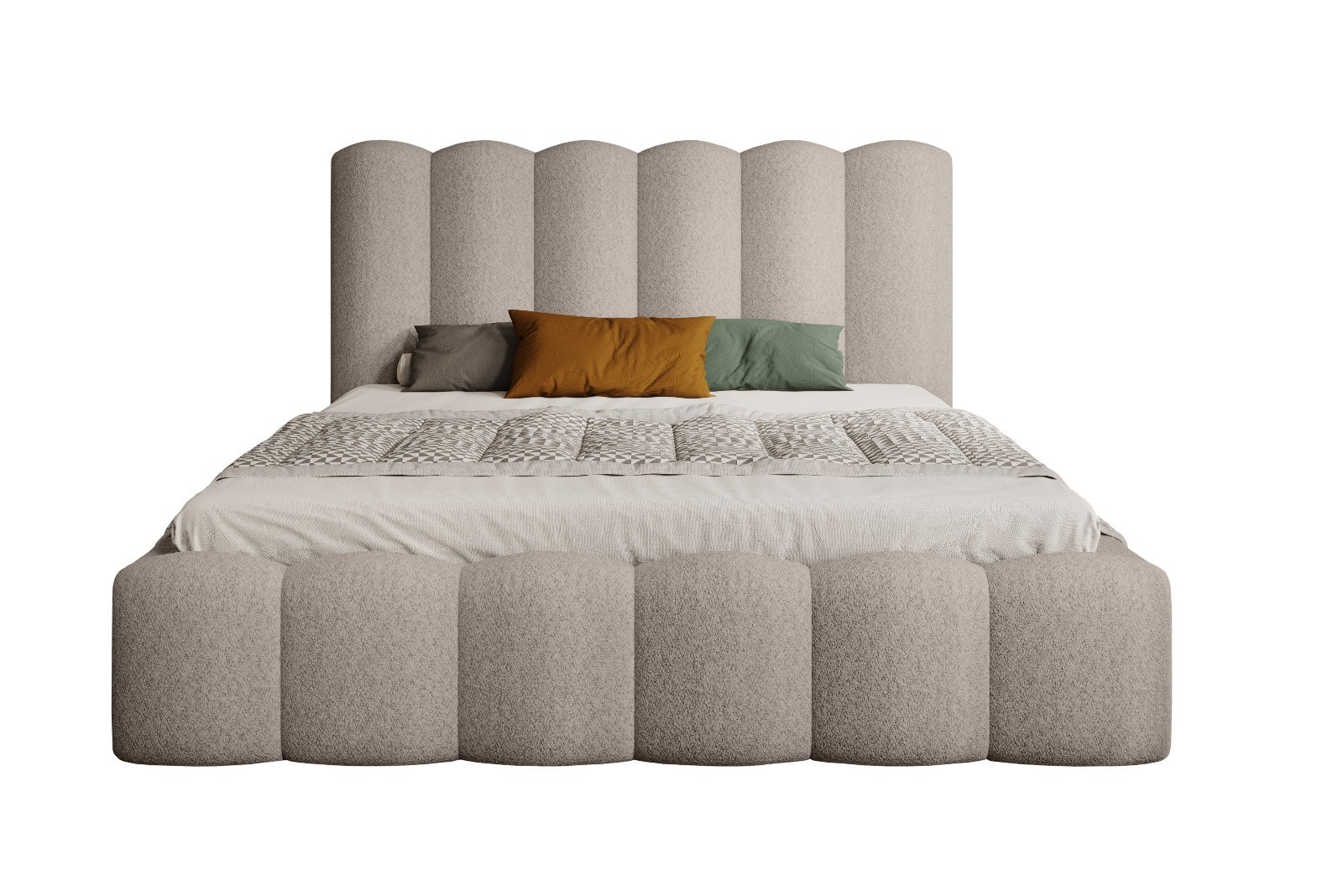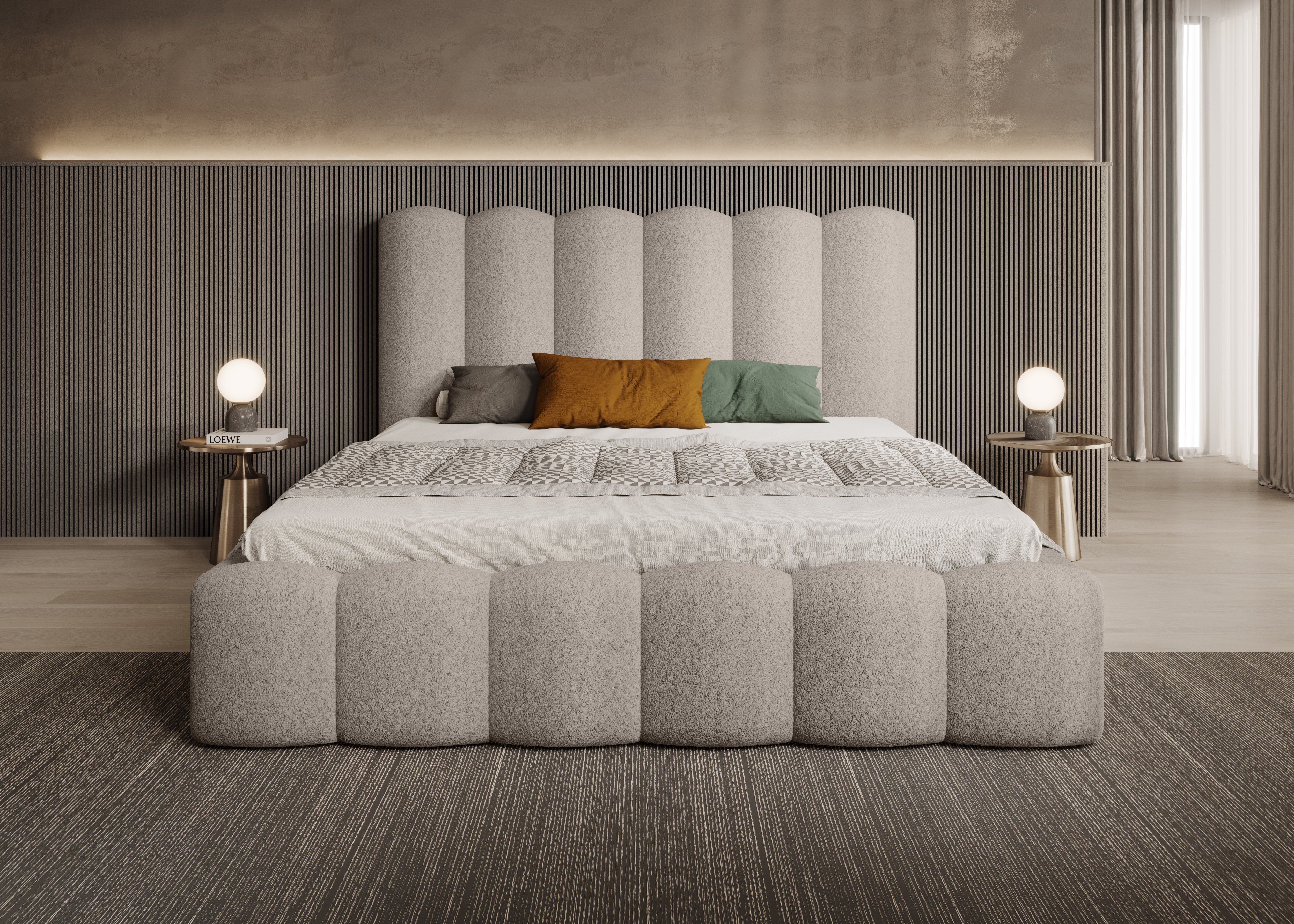 Łóżko tapicerowane Mona V łączy stylową estetykę z wysoką funkcjonalnością, tworząc idealne rozwiązanie do nowoczesnej sypialni. Wysokie, tapicerowane wezgłowie oraz ozdobny front z półwałkami nadają bryle elegancki i wyrazisty charakter.