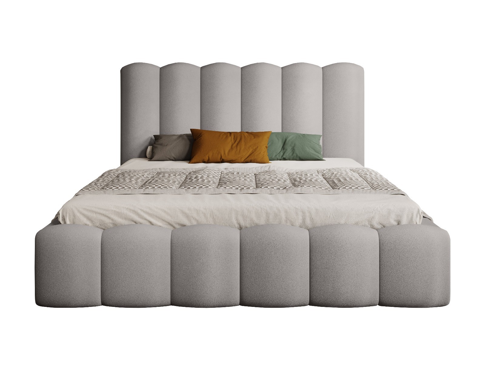 Łóżko tapicerowane Mona V to harmonijne połączenie stylowej estetyki i praktycznych rozwiązań. Wysokie, komfortowe wezgłowie oraz ozdobny front z półwałkami nadają bryle nowoczesny i elegancki charakter, idealnie wpisujący się w różnorodne aranżacje sypialni.