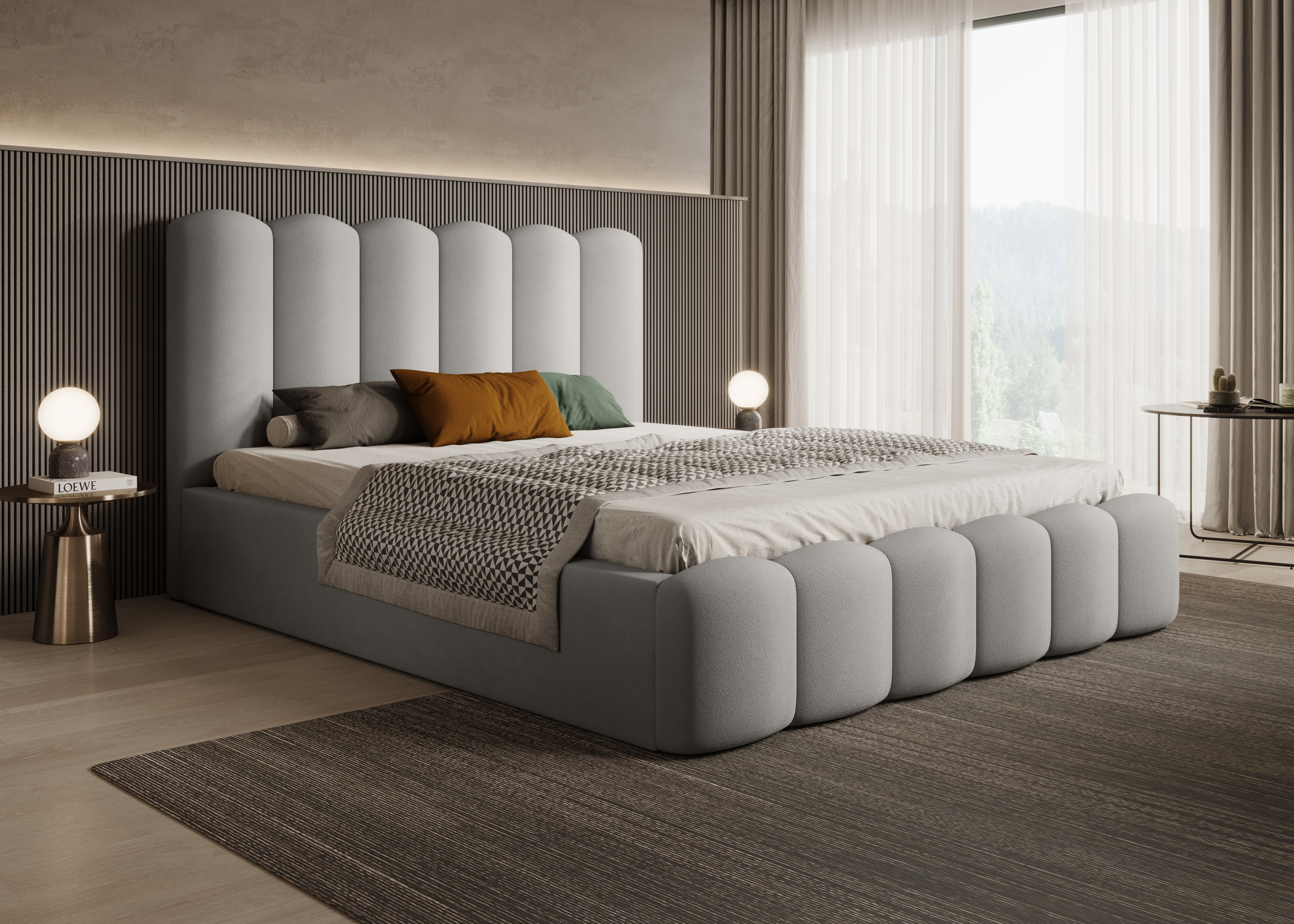 Łóżko tapicerowane Mona V to harmonijne połączenie stylowej estetyki i praktycznych rozwiązań. Wysokie, komfortowe wezgłowie oraz ozdobny front z półwałkami nadają bryle nowoczesny i elegancki charakter, idealnie wpisujący się w różnorodne aranżacje sypialni.