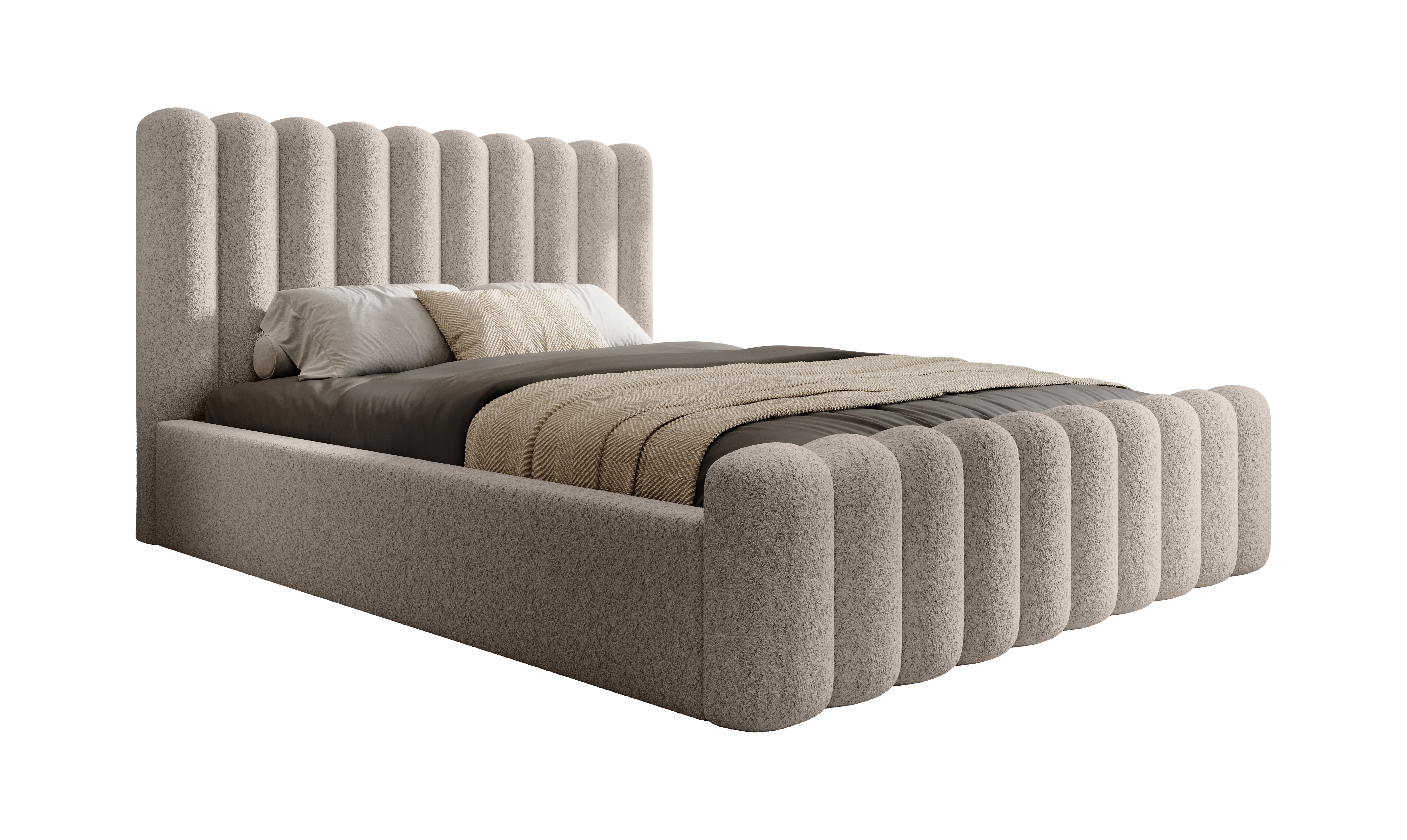 Łóżko tapicerowane Mona VII to doskonałe połączenie stylowego wyglądu i praktycznych rozwiązań. Wysokie, tapicerowane wezgłowie zapewnia wygodne oparcie, a dekoracyjny front z półwałkami nadaje bryle elegancki, nowoczesny charakter, idealny do współczesnych sypialni.