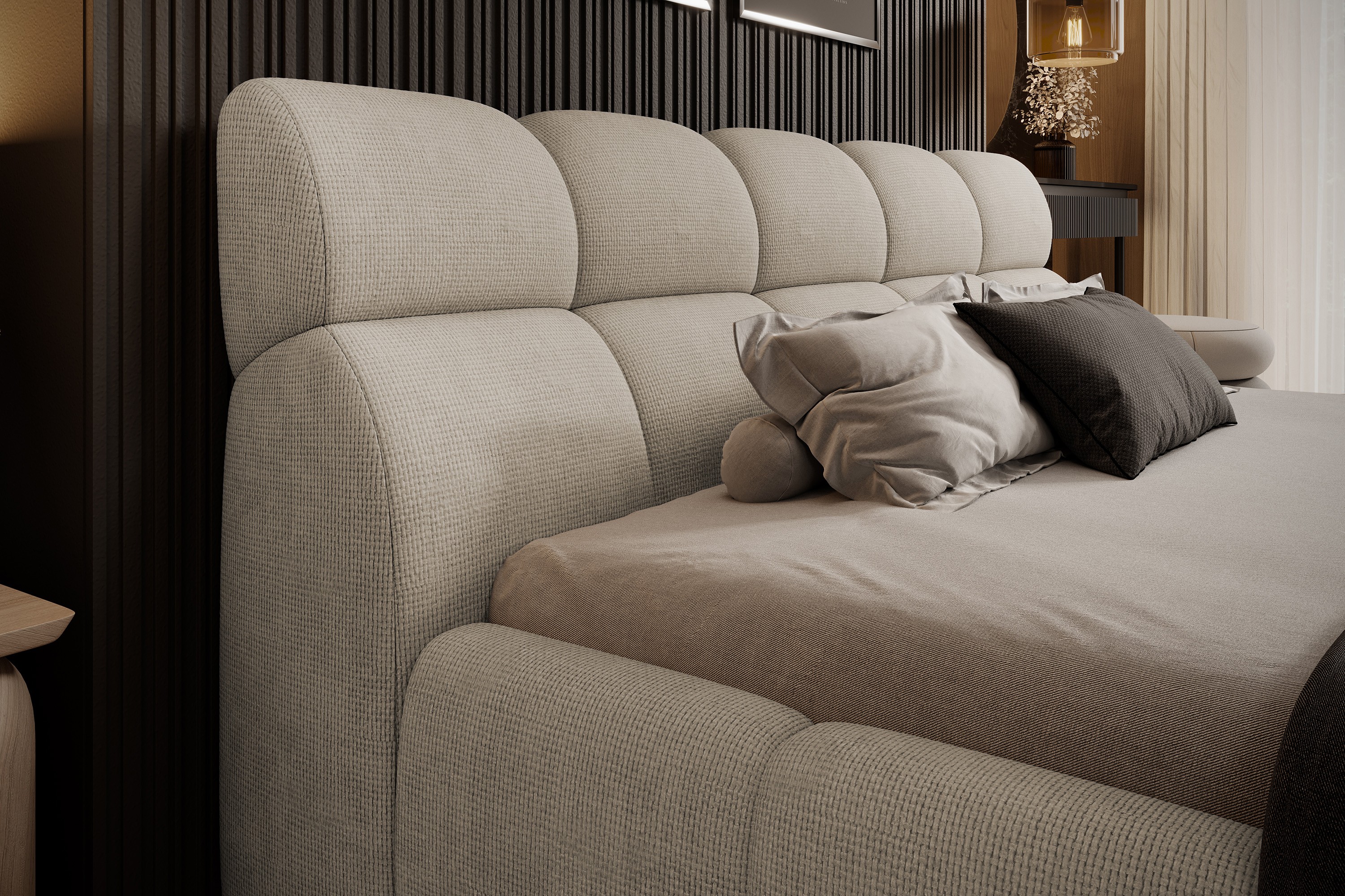 Łóżko tapicerowane GIULIA zachwyca swoją elegancką i nowoczesną formą, dzięki czemu staje się centralnym punktem każdej sypialni. To wyjątkowy model, który wyróżnia się licznymi, głębokimi przeszyciami oraz stylowymi pikowaniami, nadającymi mu luksusowy charakter.