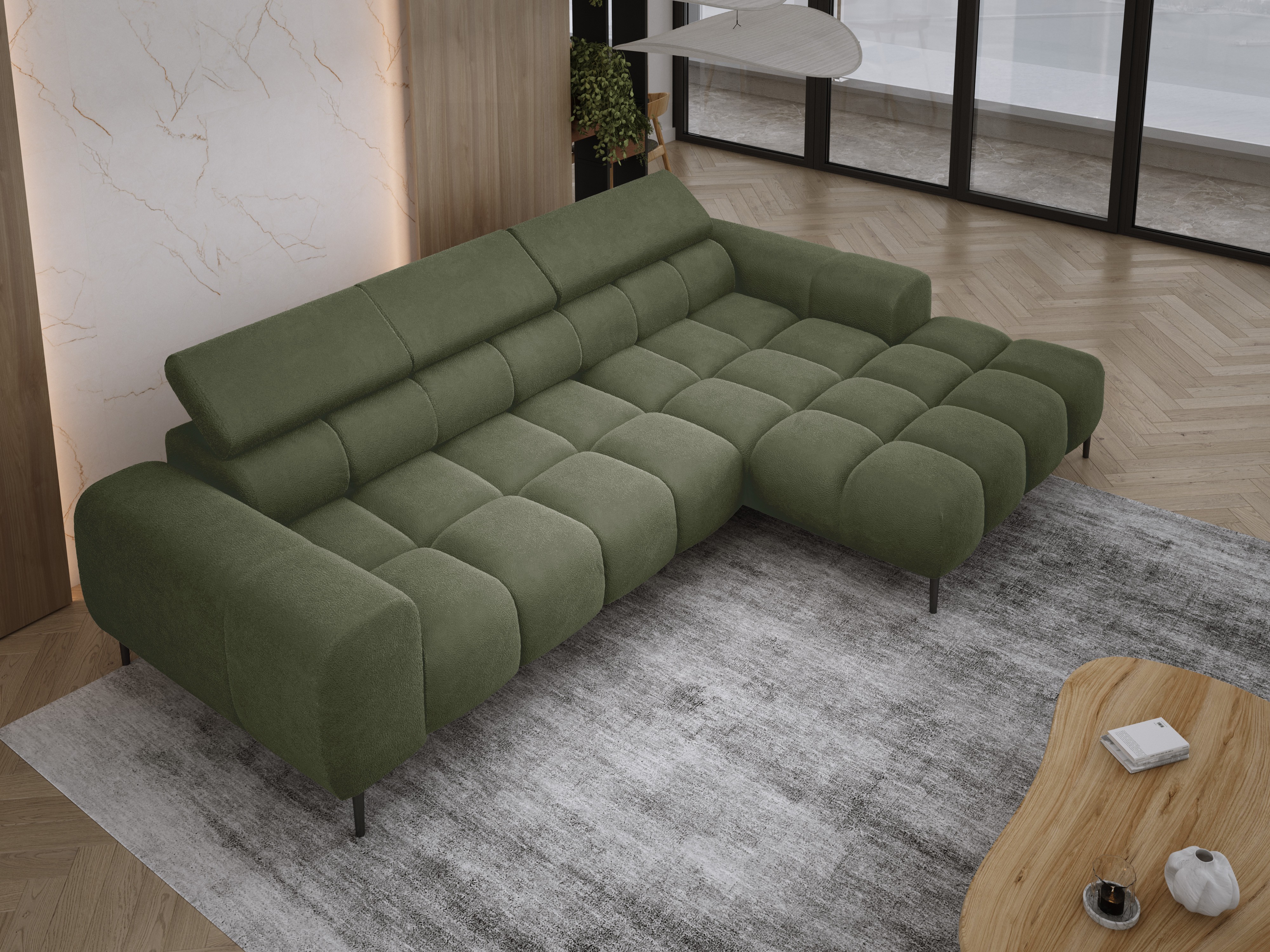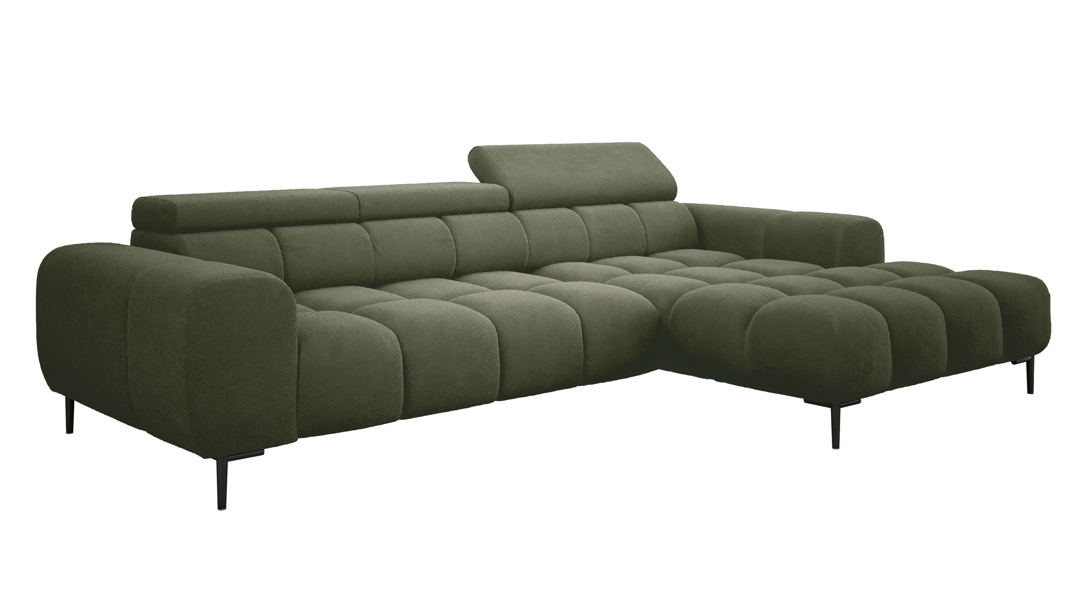 Pikowane siedzisko nadaje narożnikowi nowoczesnego charakteru, a wysokie metalowe nóżki (czarne lub złote) w stylu loftowym dodają mu lekkości i elegancji.