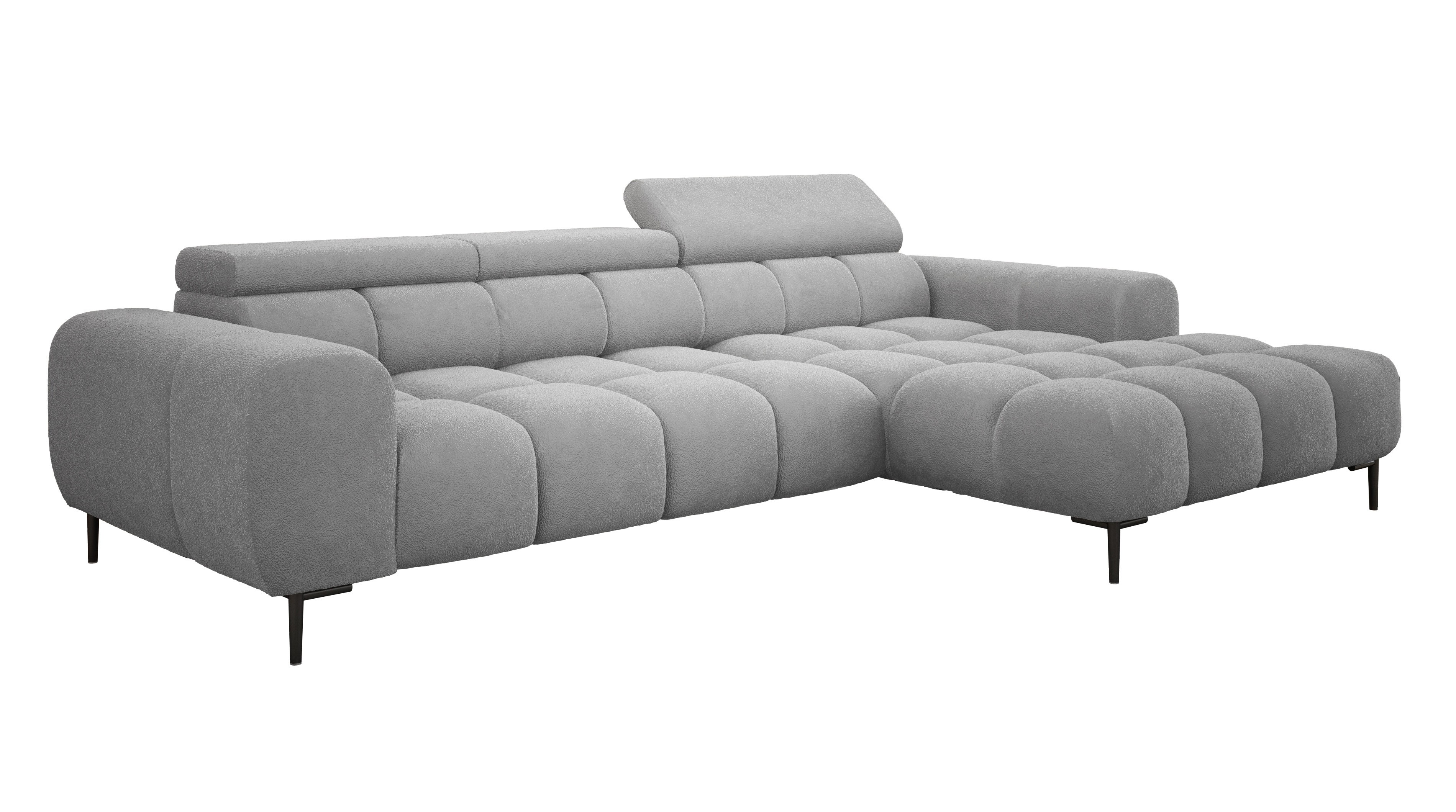 Pikowane siedzisko nadaje narożnikowi nowoczesnego charakteru, a wysokie metalowe nóżki (czarne lub złote) w stylu loftowym dodają mu lekkości i elegancji.
