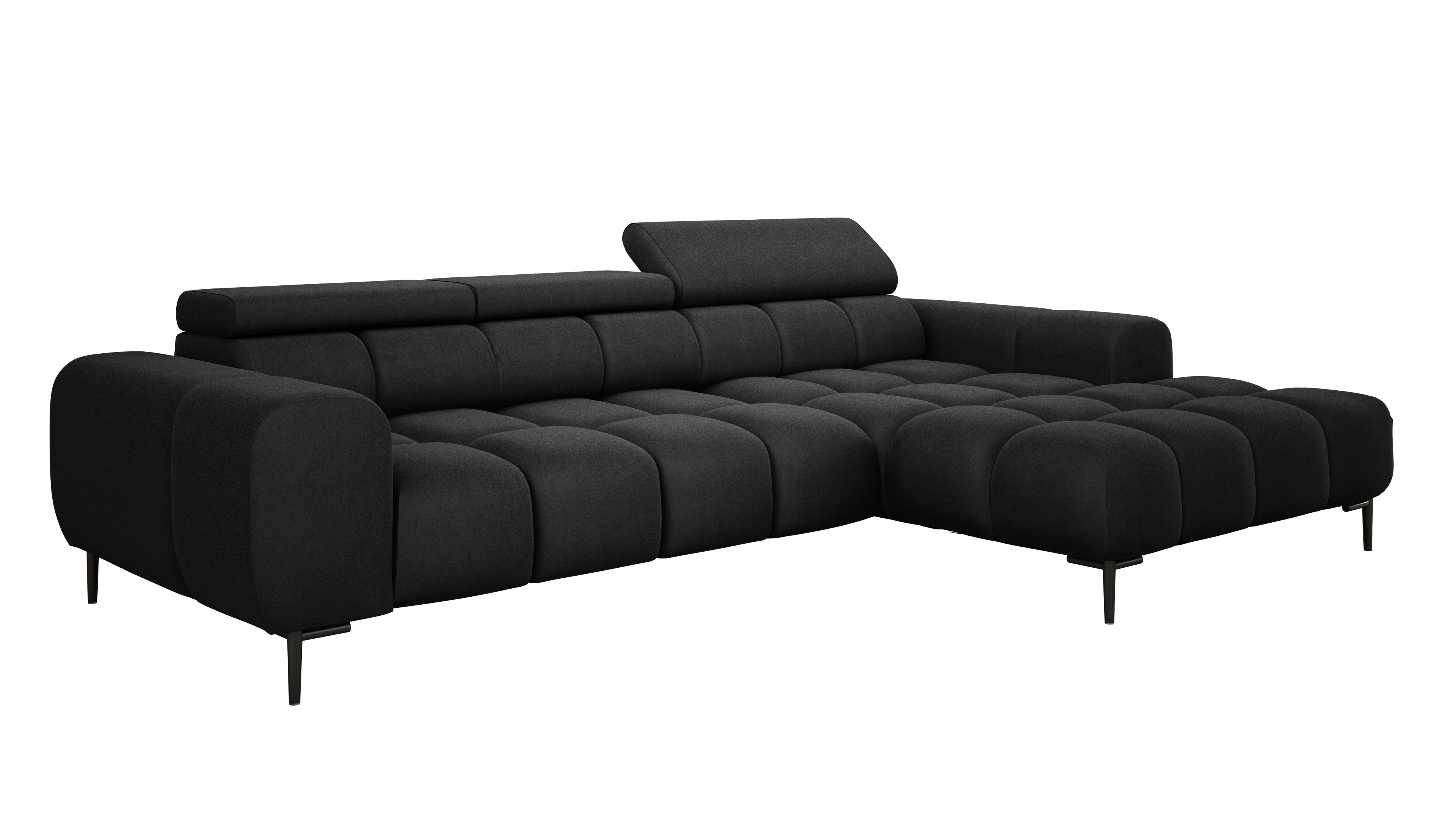 Pikowane siedzisko nadaje narożnikowi nowoczesnego charakteru, a wysokie metalowe nóżki (czarne lub złote) w stylu loftowym dodają mu lekkości i elegancji.