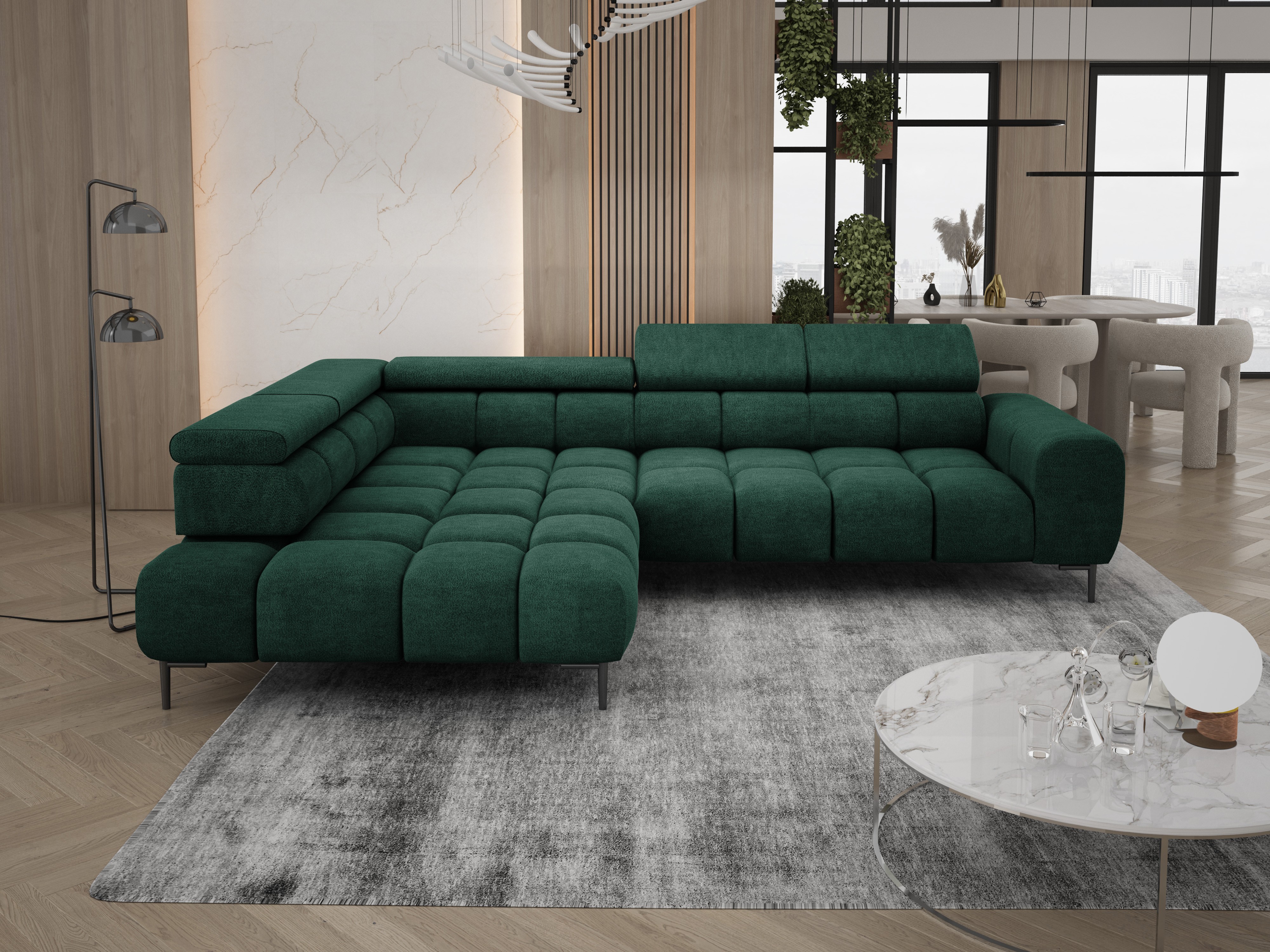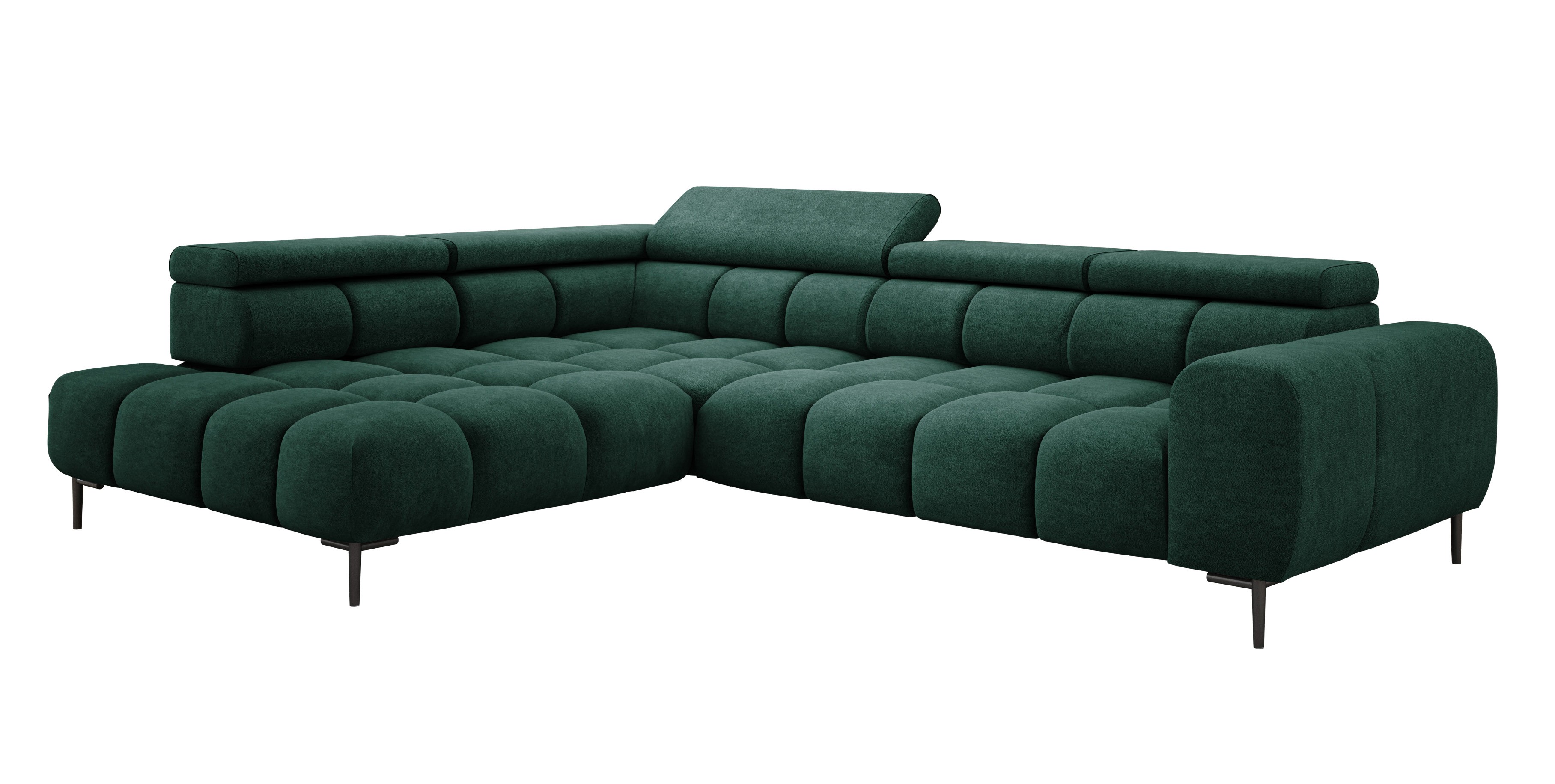 Stylowe pikowane siedzisko i wysokie metalowe nóżki (dostępne w kolorze czarnym lub złotym) nadają narożnikowi lekko loftowy, a jednocześnie nowoczesny charakter.