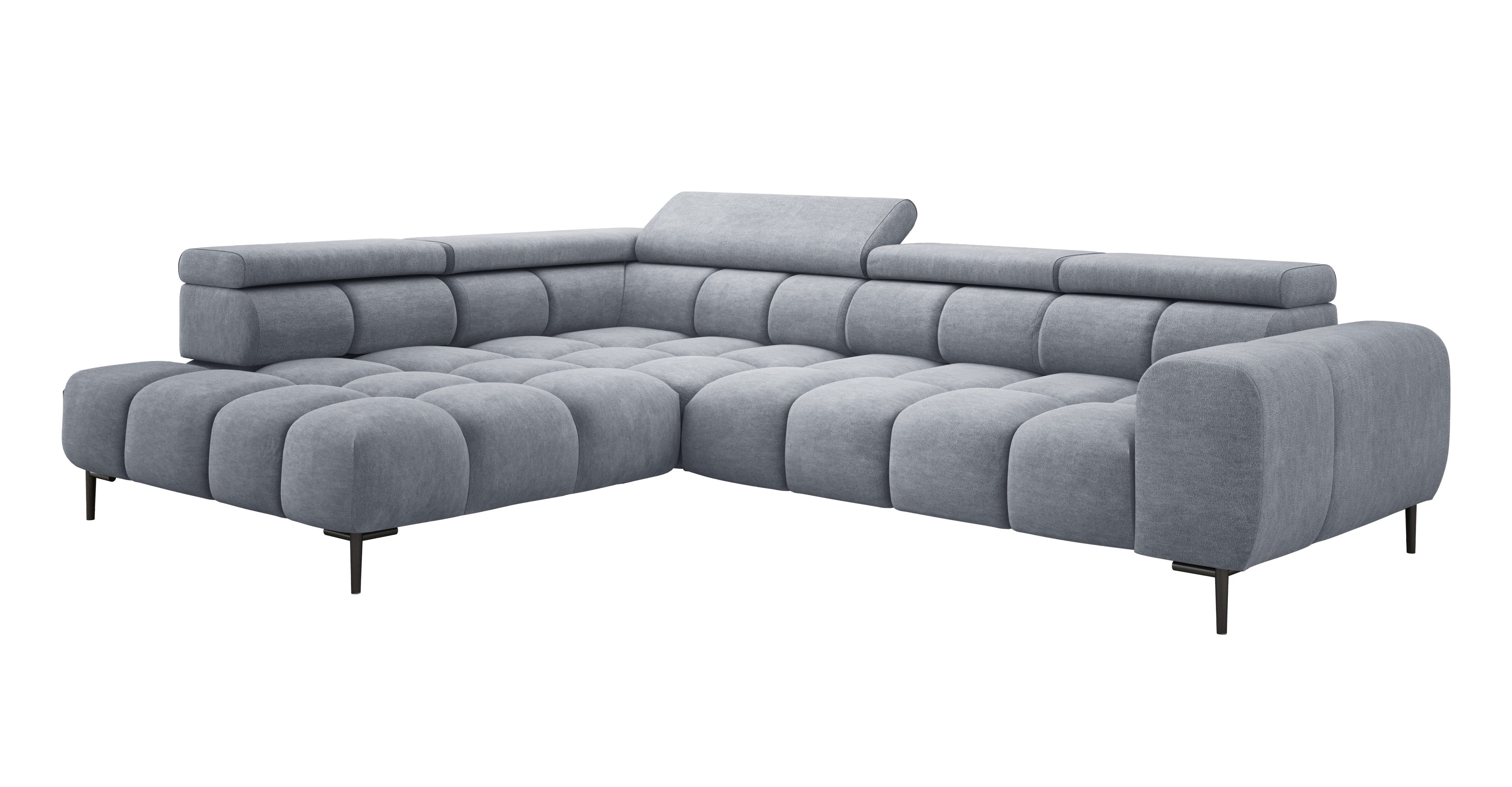 Stylowe pikowane siedzisko i wysokie metalowe nóżki (dostępne w kolorze czarnym lub złotym) nadają narożnikowi lekko loftowy, a jednocześnie nowoczesny charakter.