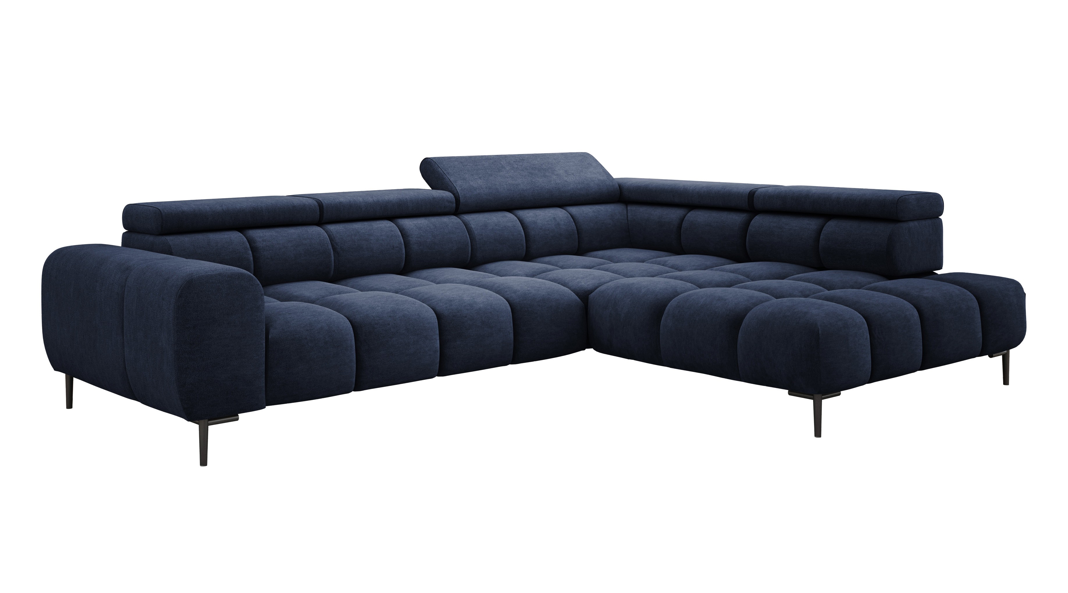 Stylowe pikowane siedzisko i wysokie metalowe nóżki (dostępne w kolorze czarnym lub złotym) nadają narożnikowi lekko loftowy, a jednocześnie nowoczesny charakter.