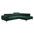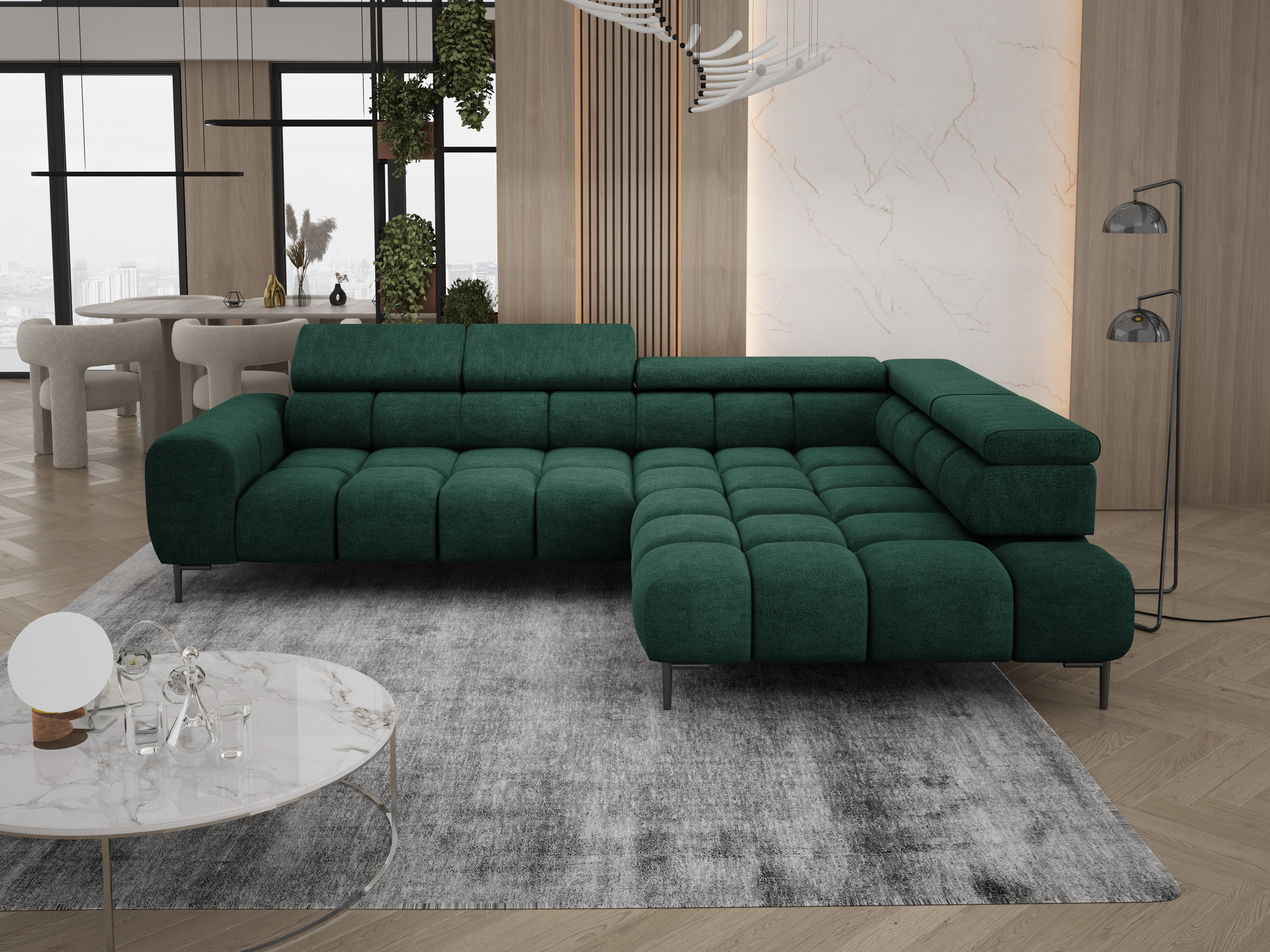 Stylowe pikowane siedzisko i wysokie metalowe nóżki (dostępne w kolorze czarnym lub złotym) nadają narożnikowi lekko loftowy, a jednocześnie nowoczesny charakter.
