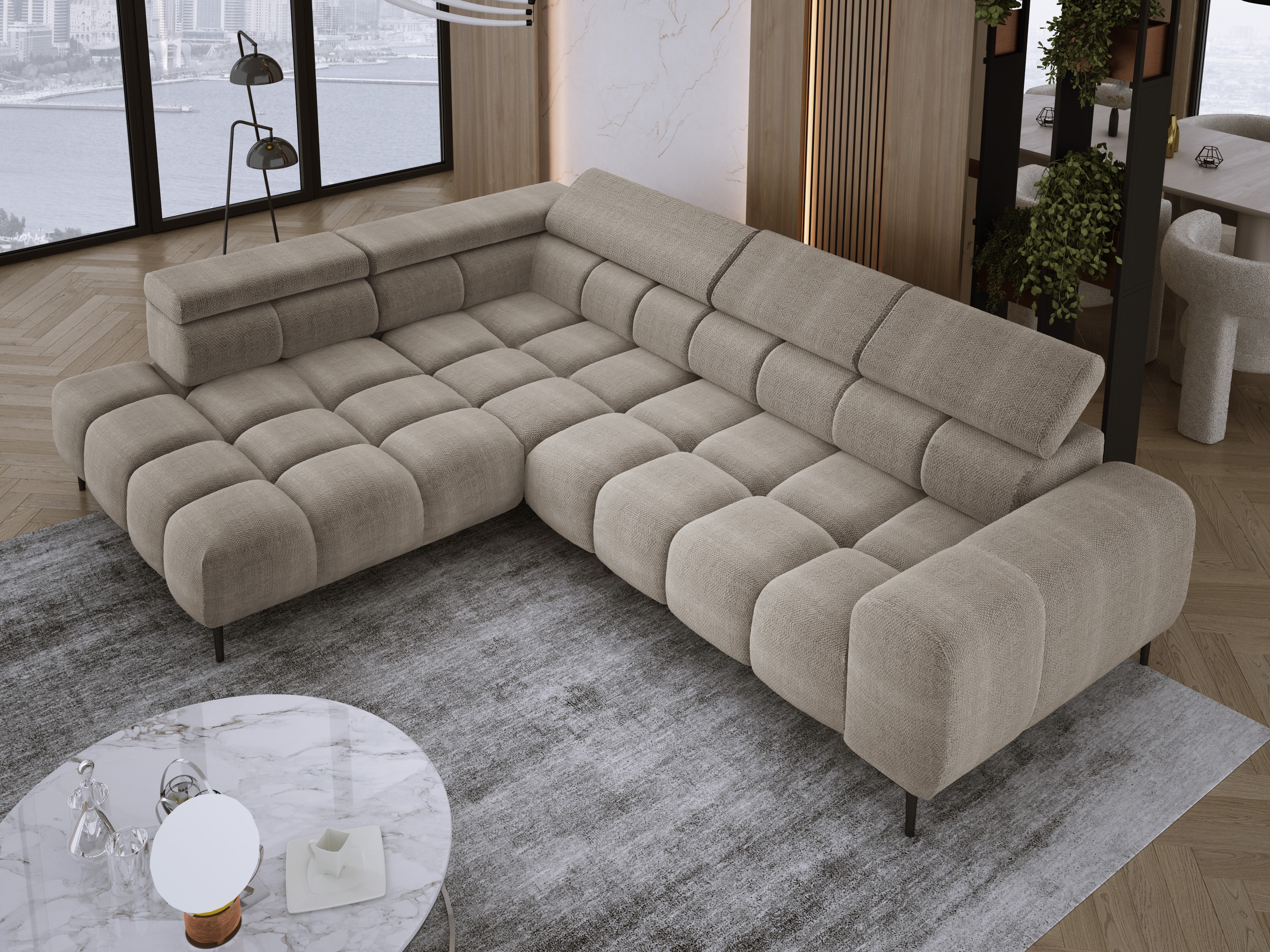 Stylowe pikowane siedzisko i wysokie metalowe nóżki (dostępne w kolorze czarnym lub złotym) nadają narożnikowi lekko loftowy, a jednocześnie nowoczesny charakter.