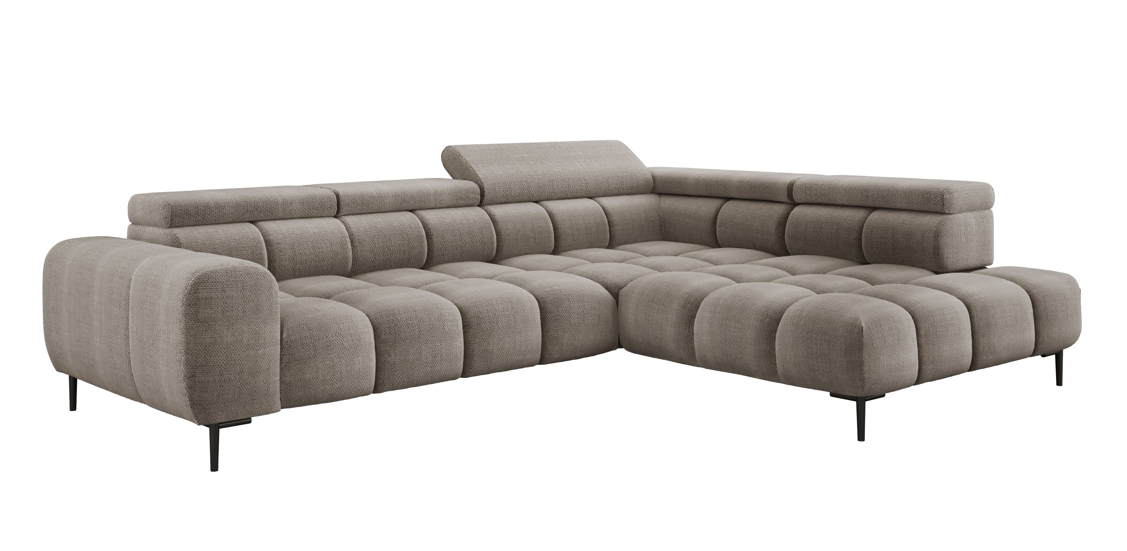 Stylowe pikowane siedzisko i wysokie metalowe nóżki (dostępne w kolorze czarnym lub złotym) nadają narożnikowi lekko loftowy, a jednocześnie nowoczesny charakter.