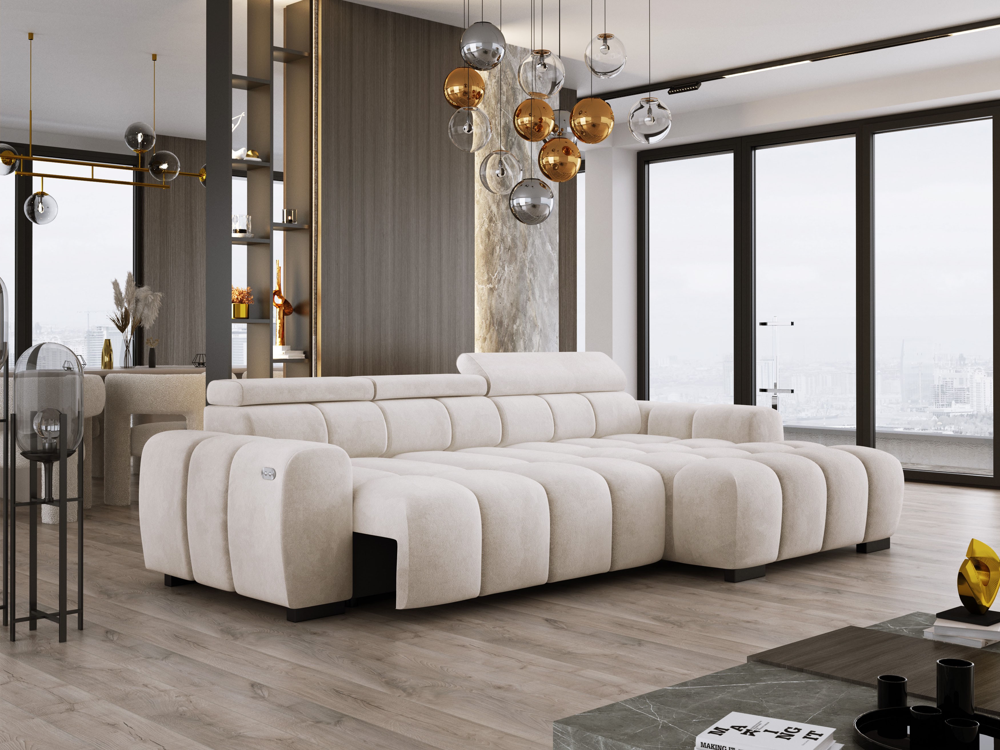 Wyposażony w elektrycznie wysuwane siedzisko (do 27 cm), OMBO oferuje wygodną przestrzeń do wypoczynku oraz praktyczną funkcję spania na co dzień.