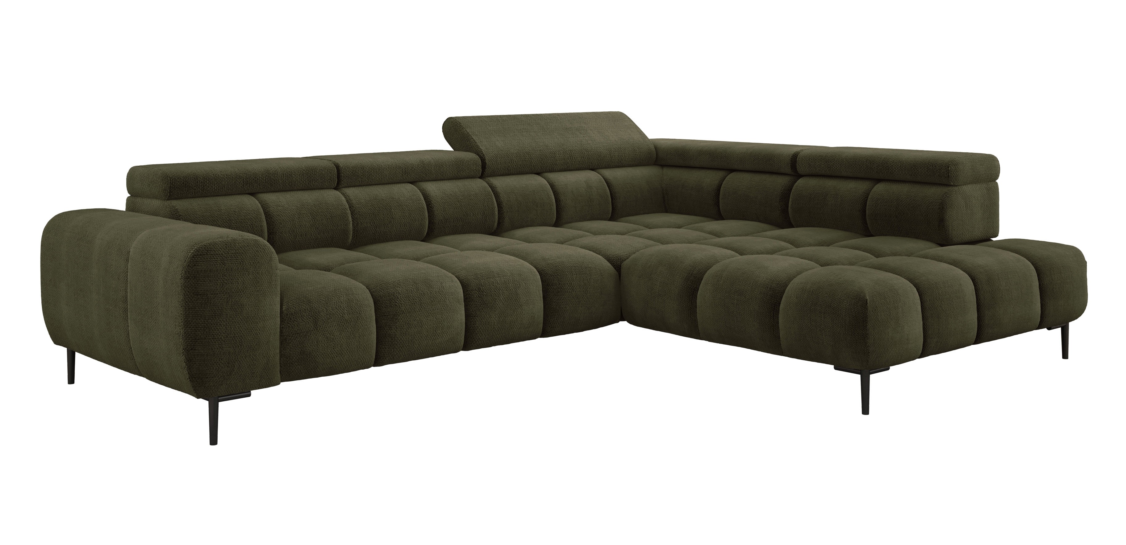Stylowe pikowane siedzisko i wysokie metalowe nóżki (dostępne w kolorze czarnym lub złotym) nadają narożnikowi lekko loftowy, a jednocześnie nowoczesny charakter.