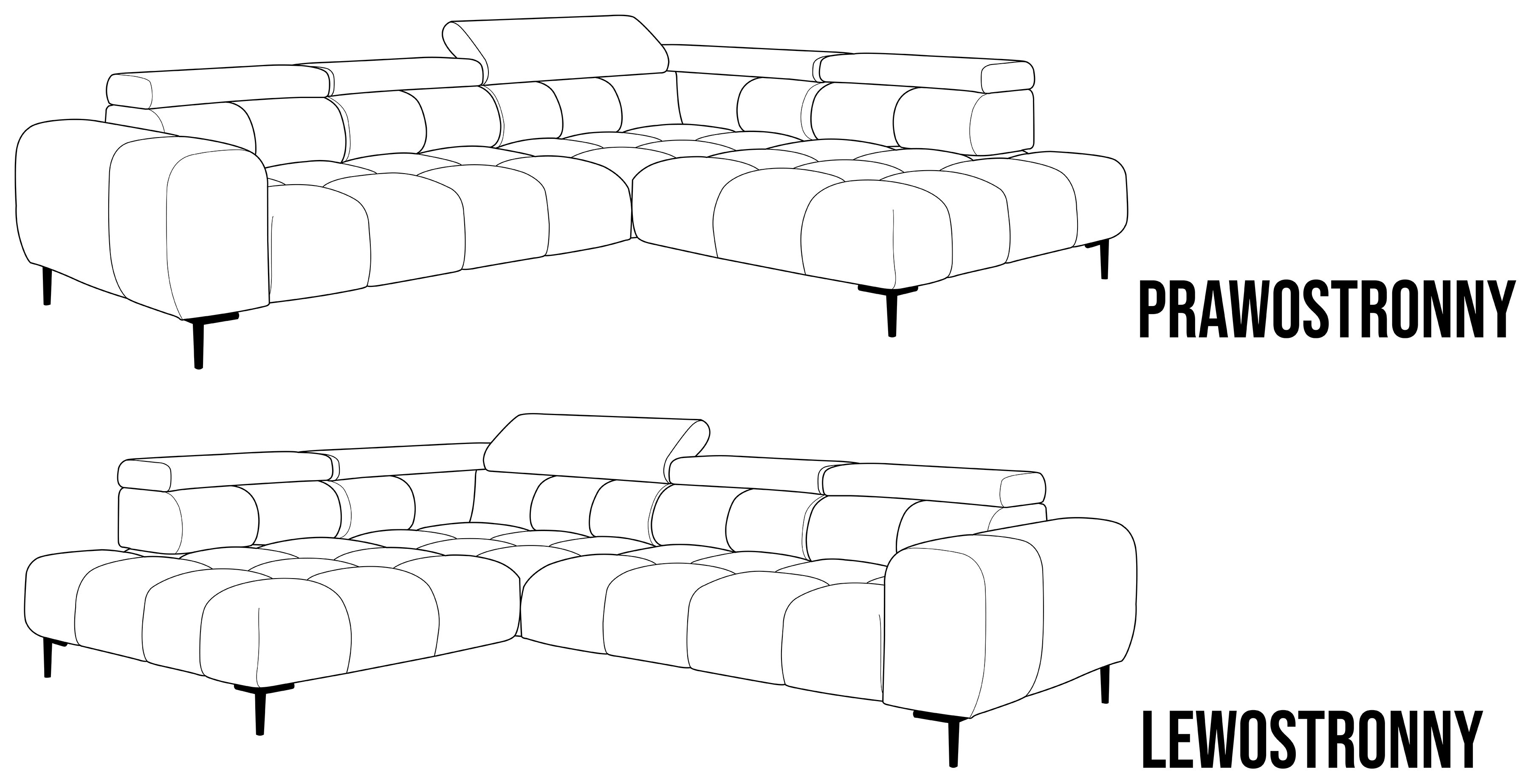 Stylowe pikowane siedzisko i wysokie metalowe nóżki (dostępne w kolorze czarnym lub złotym) nadają narożnikowi lekko loftowy, a jednocześnie nowoczesny charakter.