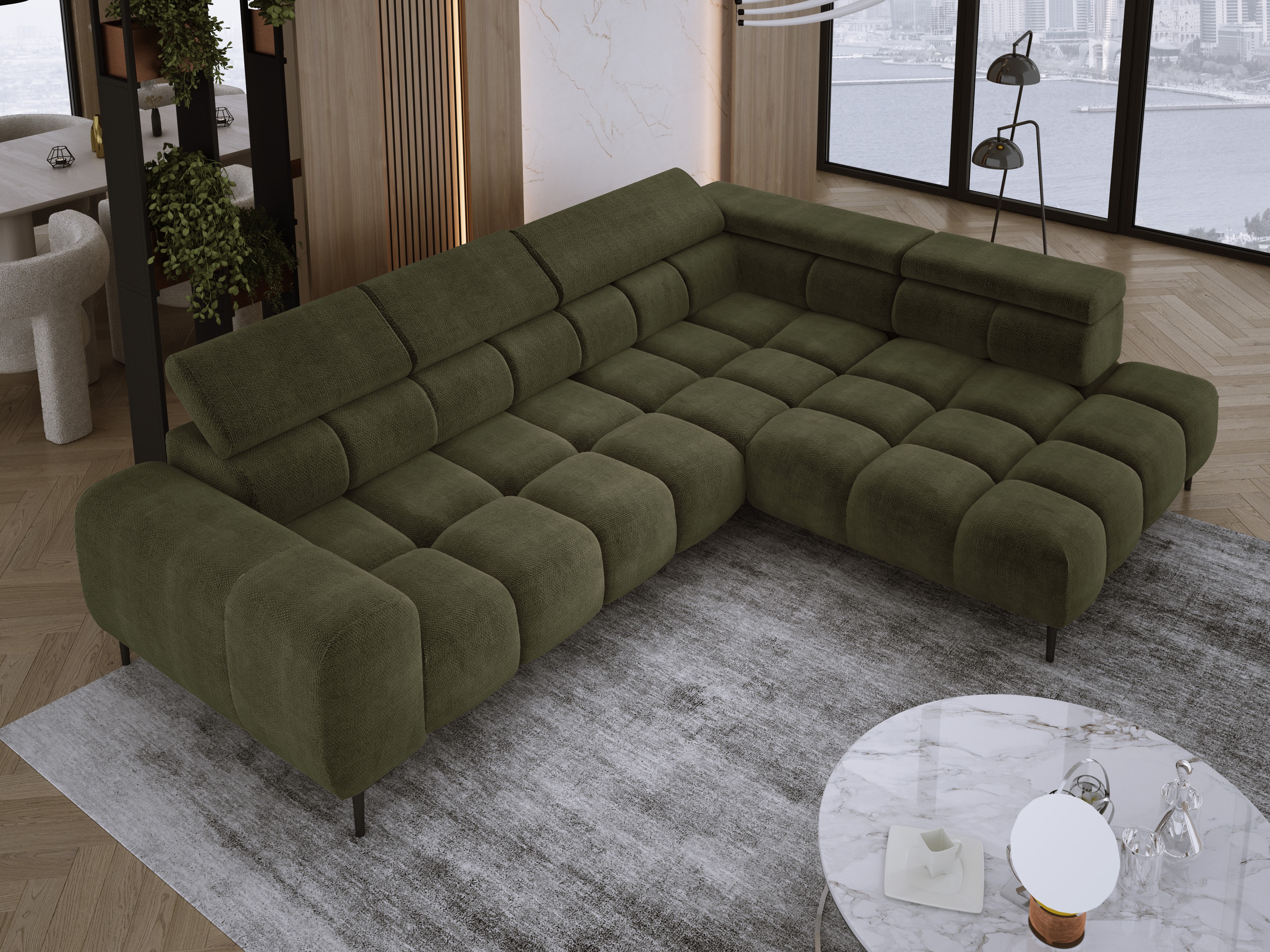 Stylowe pikowane siedzisko i wysokie metalowe nóżki (dostępne w kolorze czarnym lub złotym) nadają narożnikowi lekko loftowy, a jednocześnie nowoczesny charakter.