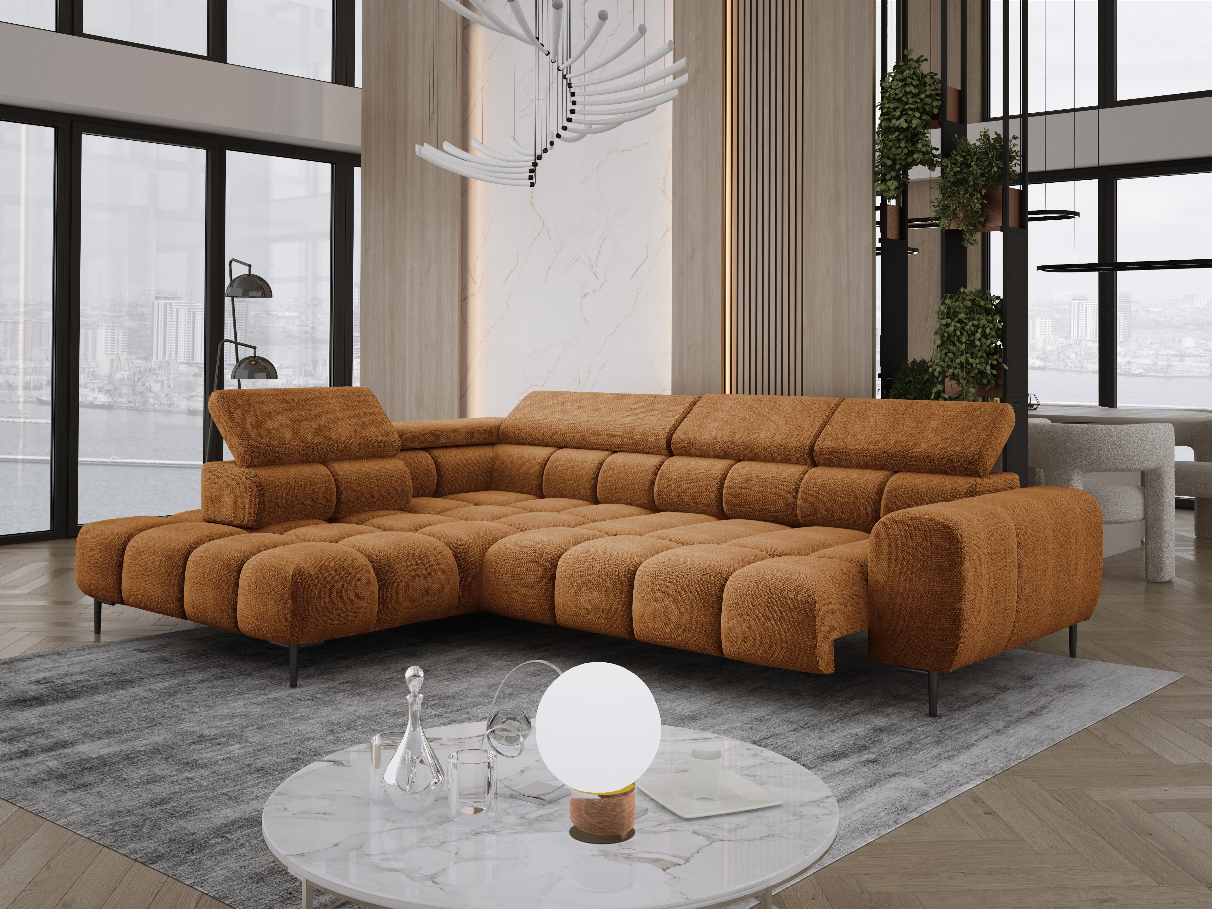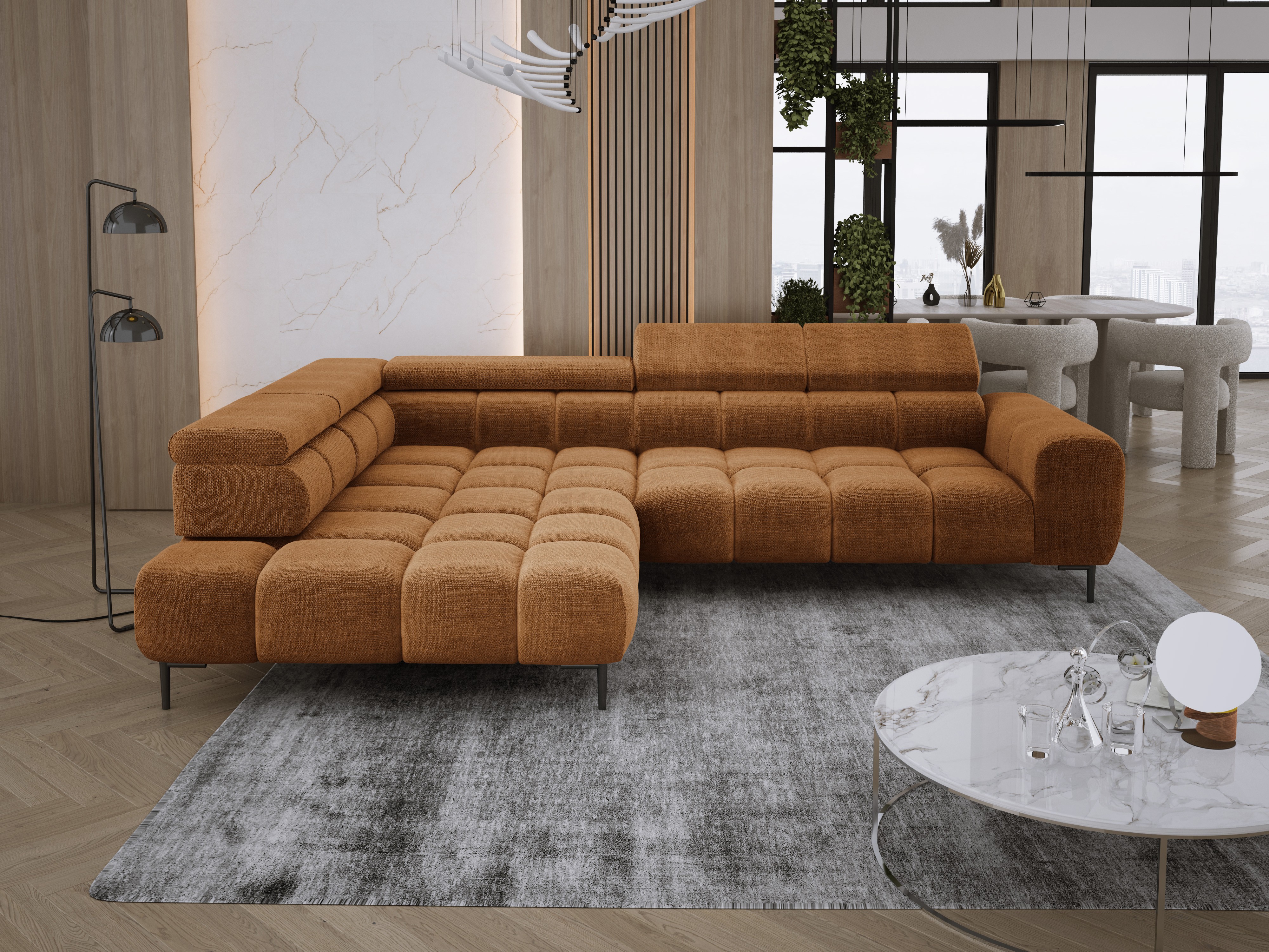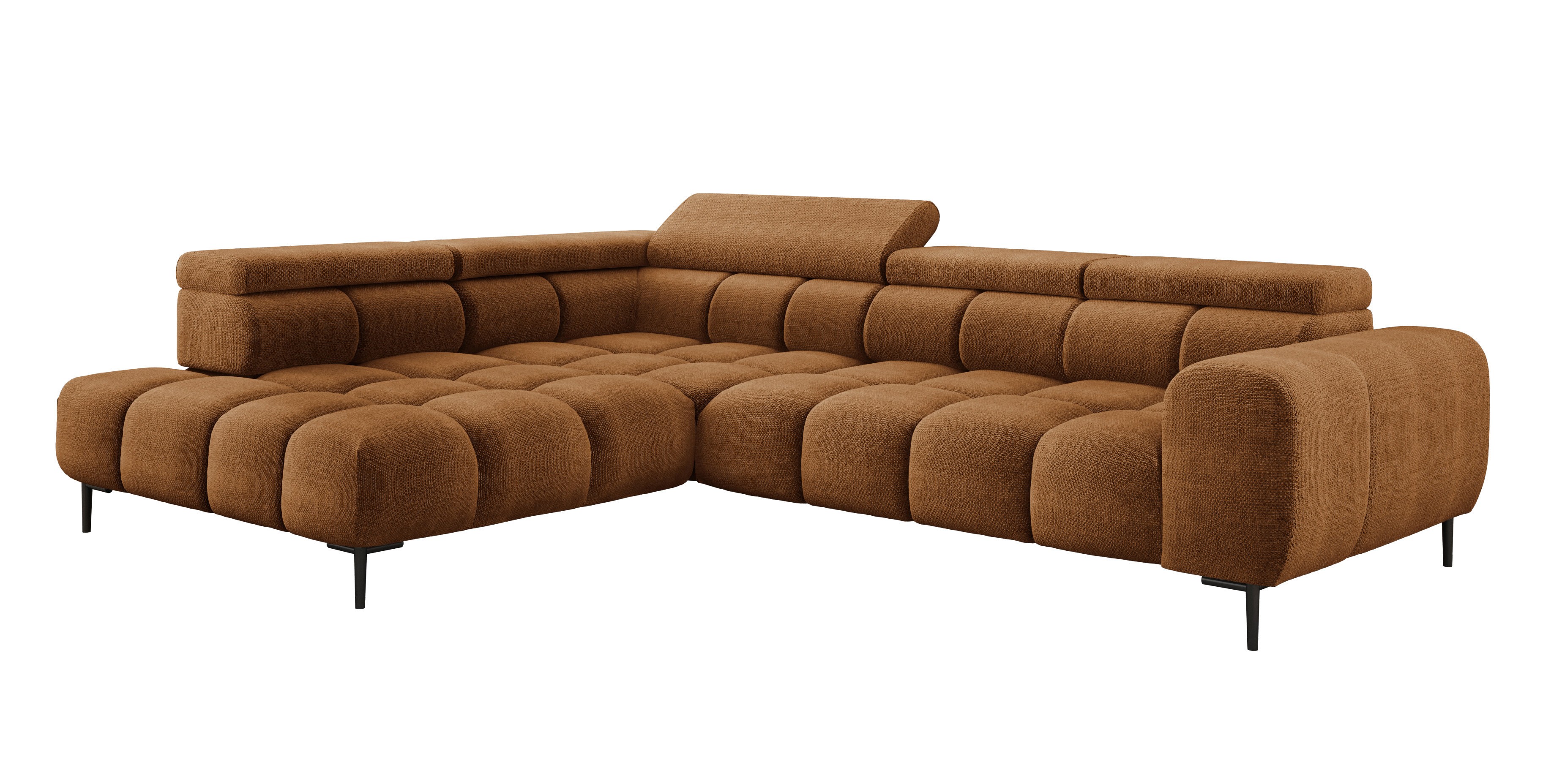 Stylowe pikowane siedzisko i wysokie metalowe nóżki (dostępne w kolorze czarnym lub złotym) nadają narożnikowi lekko loftowy, a jednocześnie nowoczesny charakter.