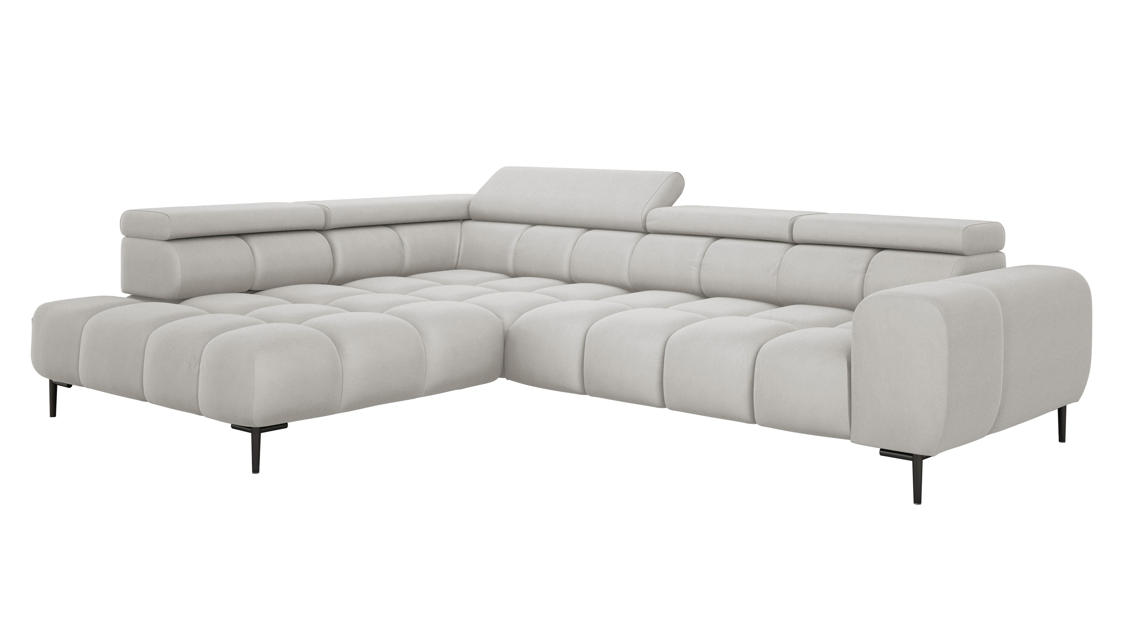 Stylowe pikowane siedzisko i wysokie metalowe nóżki (dostępne w kolorze czarnym lub złotym) nadają narożnikowi lekko loftowy, a jednocześnie nowoczesny charakter.