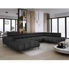 Dodatkowo narożnik wyposażony jest w przesuwne oparcie oraz 6 regulowanych zagłówków z możliwością blokady w dowolnej pozycji. Stylowe pikowane siedzisko i wysokie metalowe nóżki (dostępne w kolorze czarnym lub złotym) nadają całości elegancki, loftowy charakter.