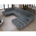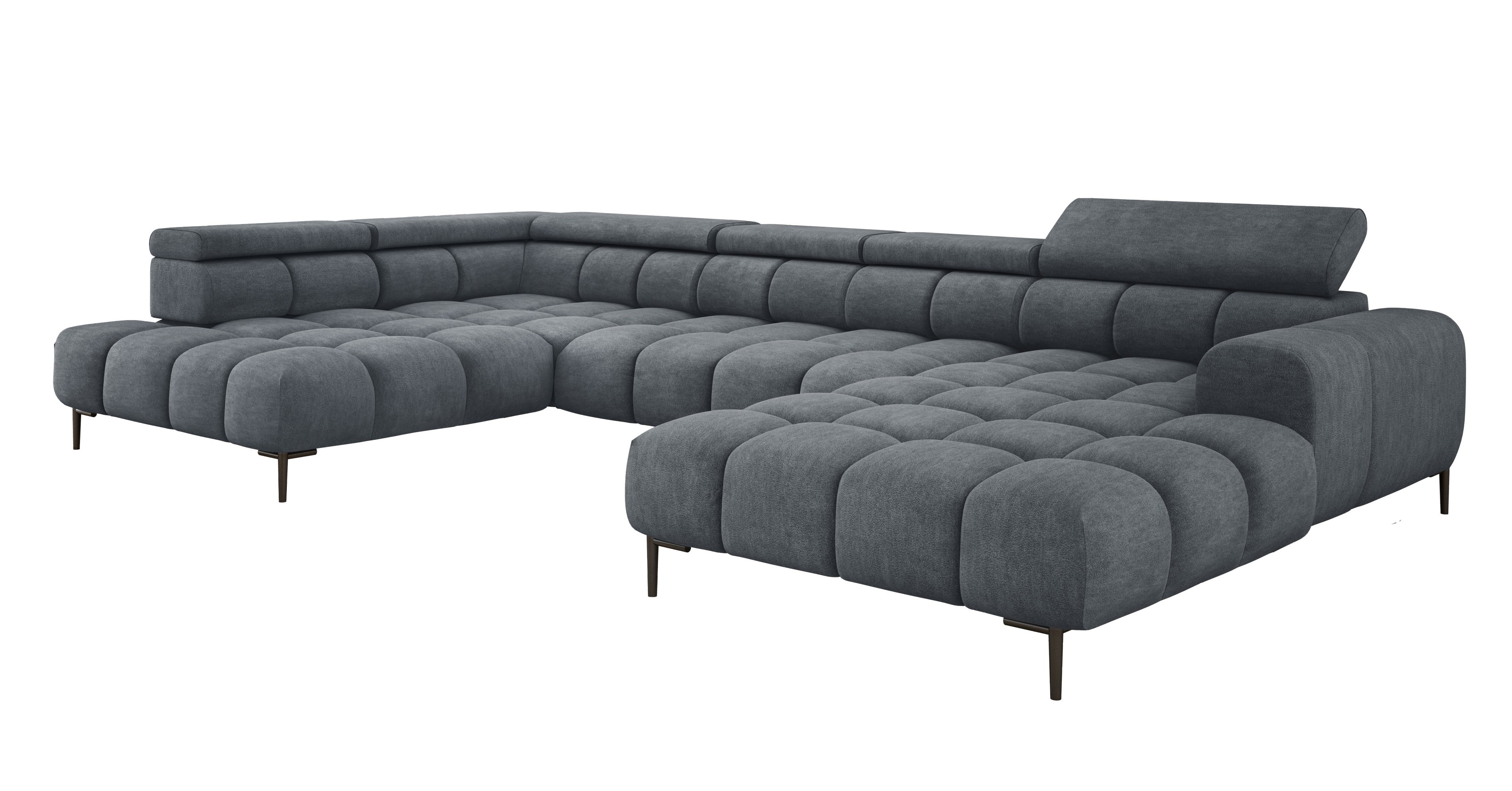 Dodatkowo narożnik wyposażony jest w przesuwne oparcie oraz 6 regulowanych zagłówków z możliwością blokady w dowolnej pozycji. Stylowe pikowane siedzisko i wysokie metalowe nóżki (dostępne w kolorze czarnym lub złotym) nadają całości elegancki, loftowy charakter.