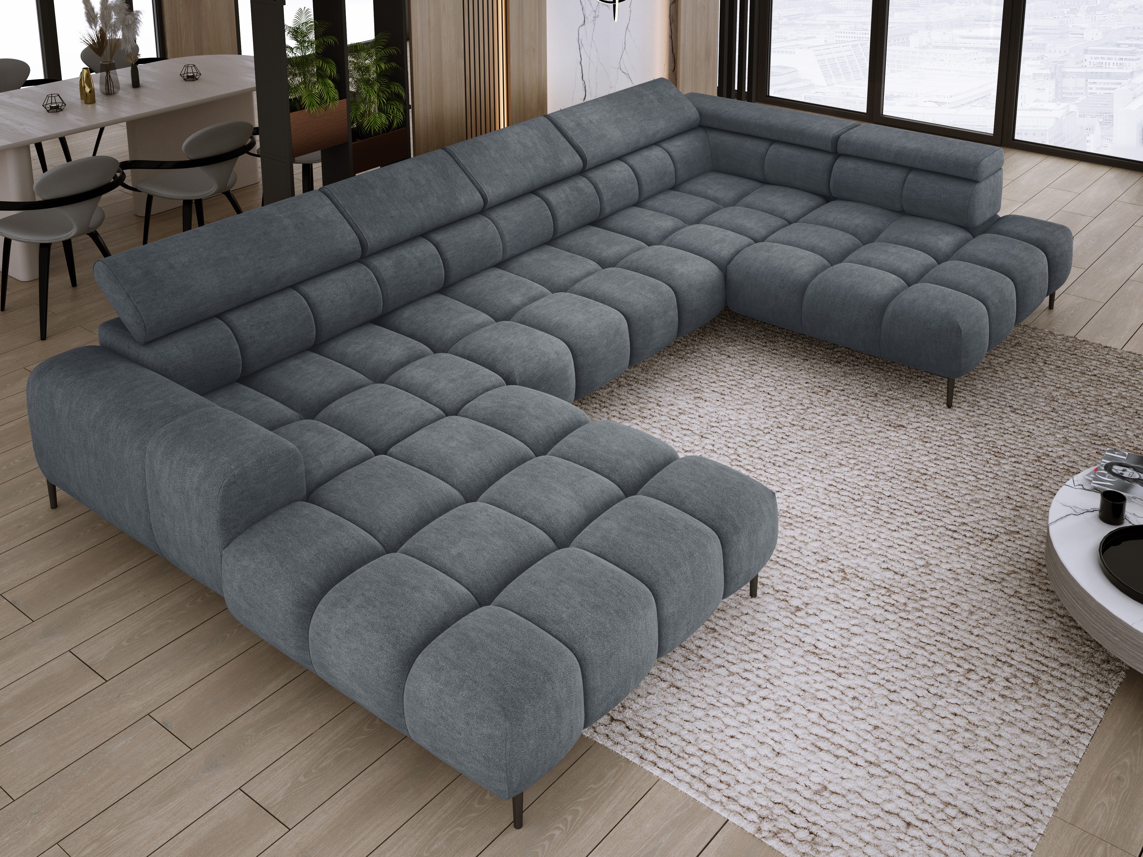 Dodatkowo narożnik wyposażony jest w przesuwne oparcie oraz 6 regulowanych zagłówków z możliwością blokady w dowolnej pozycji. Stylowe pikowane siedzisko i wysokie metalowe nóżki (dostępne w kolorze czarnym lub złotym) nadają całości elegancki, loftowy charakter.