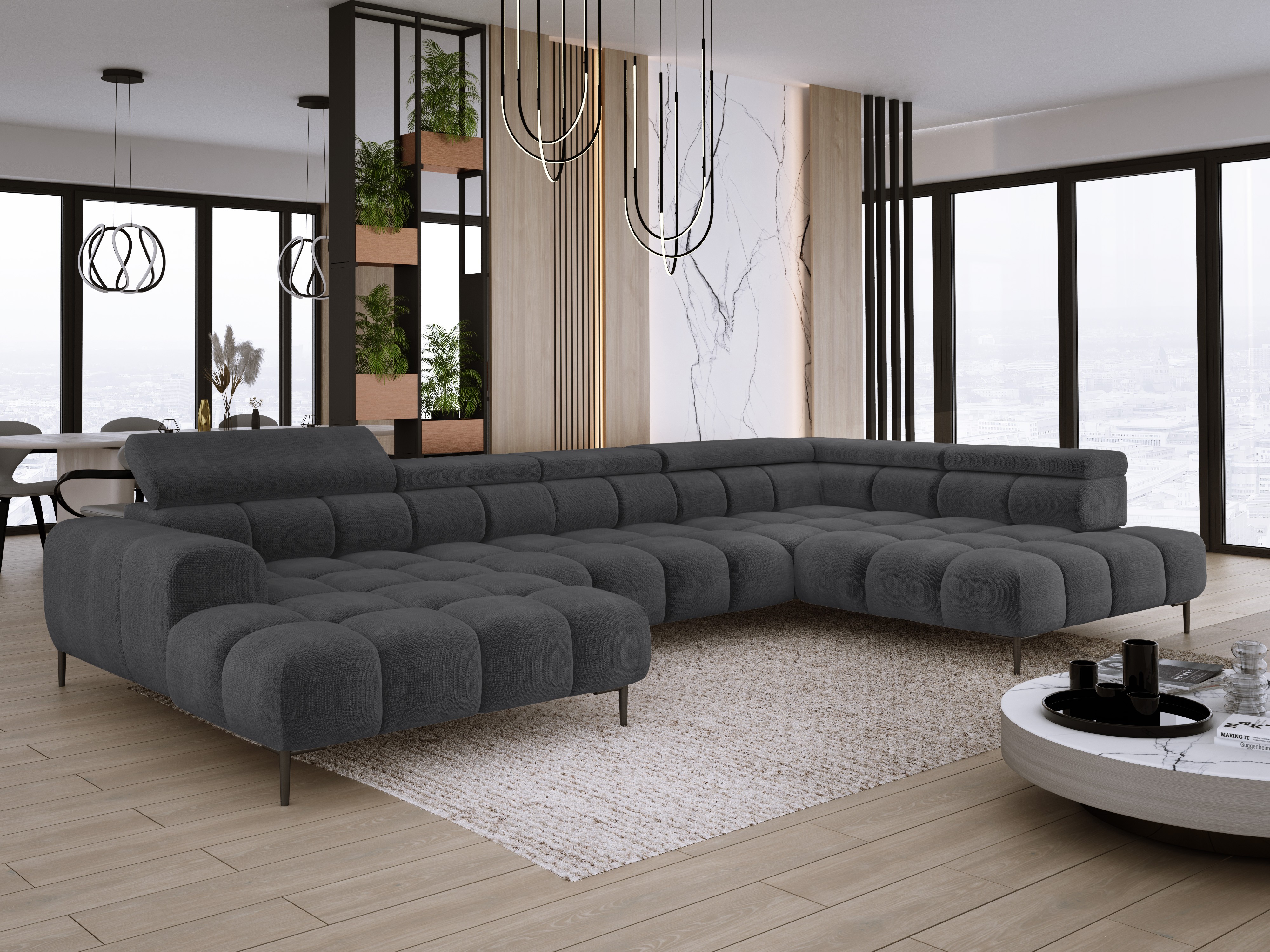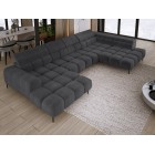 Dodatkowo narożnik wyposażony jest w przesuwne oparcie oraz 6 regulowanych zagłówków z możliwością blokady w dowolnej pozycji. Stylowe pikowane siedzisko i wysokie metalowe nóżki (dostępne w kolorze czarnym lub złotym) nadają całości elegancki, loftowy charakter.